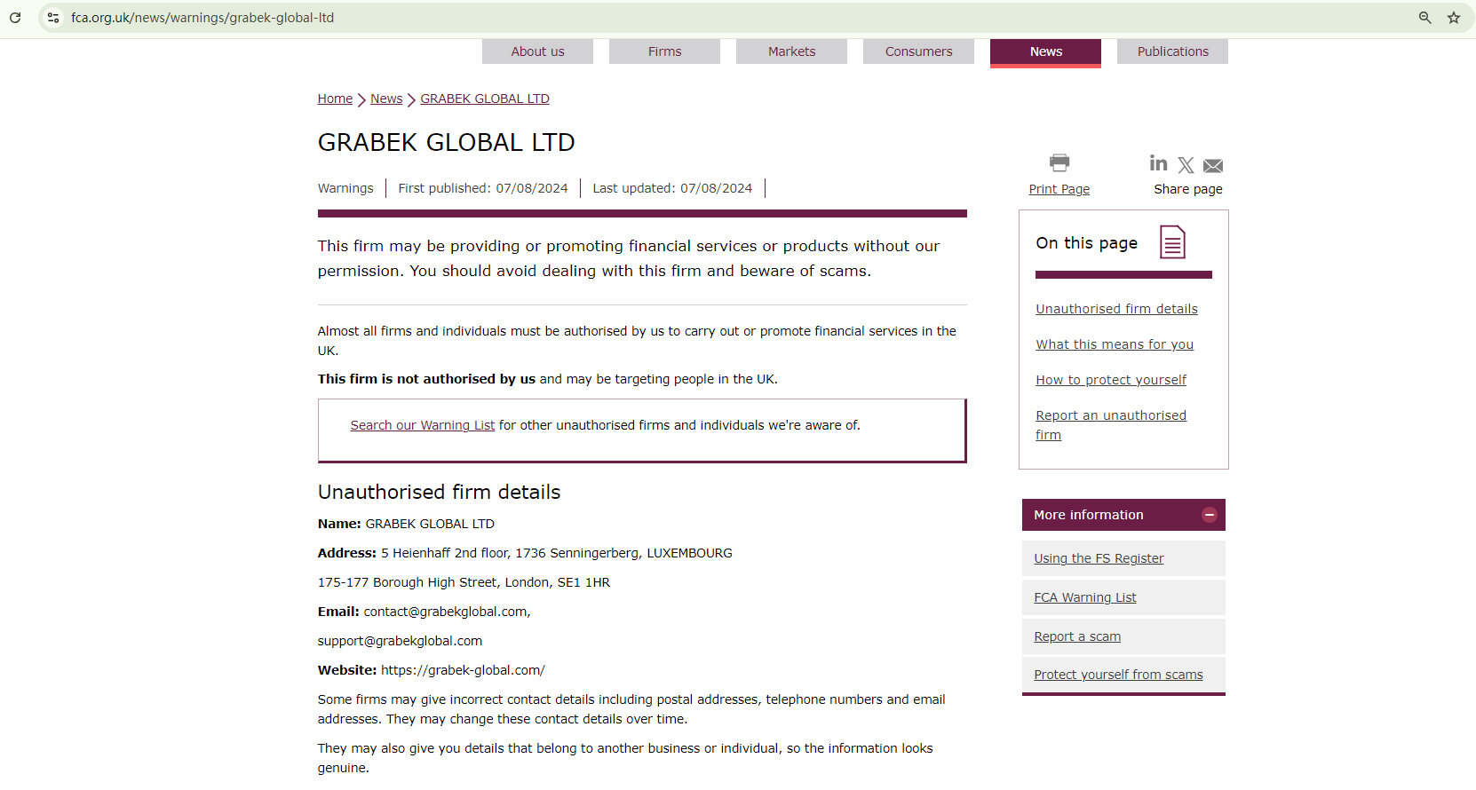 In addition, the Financial Conduct Authority (FCA) has issued a warning against Grabek Global LTD, advising investors to steer clear of the unauthorized firm.