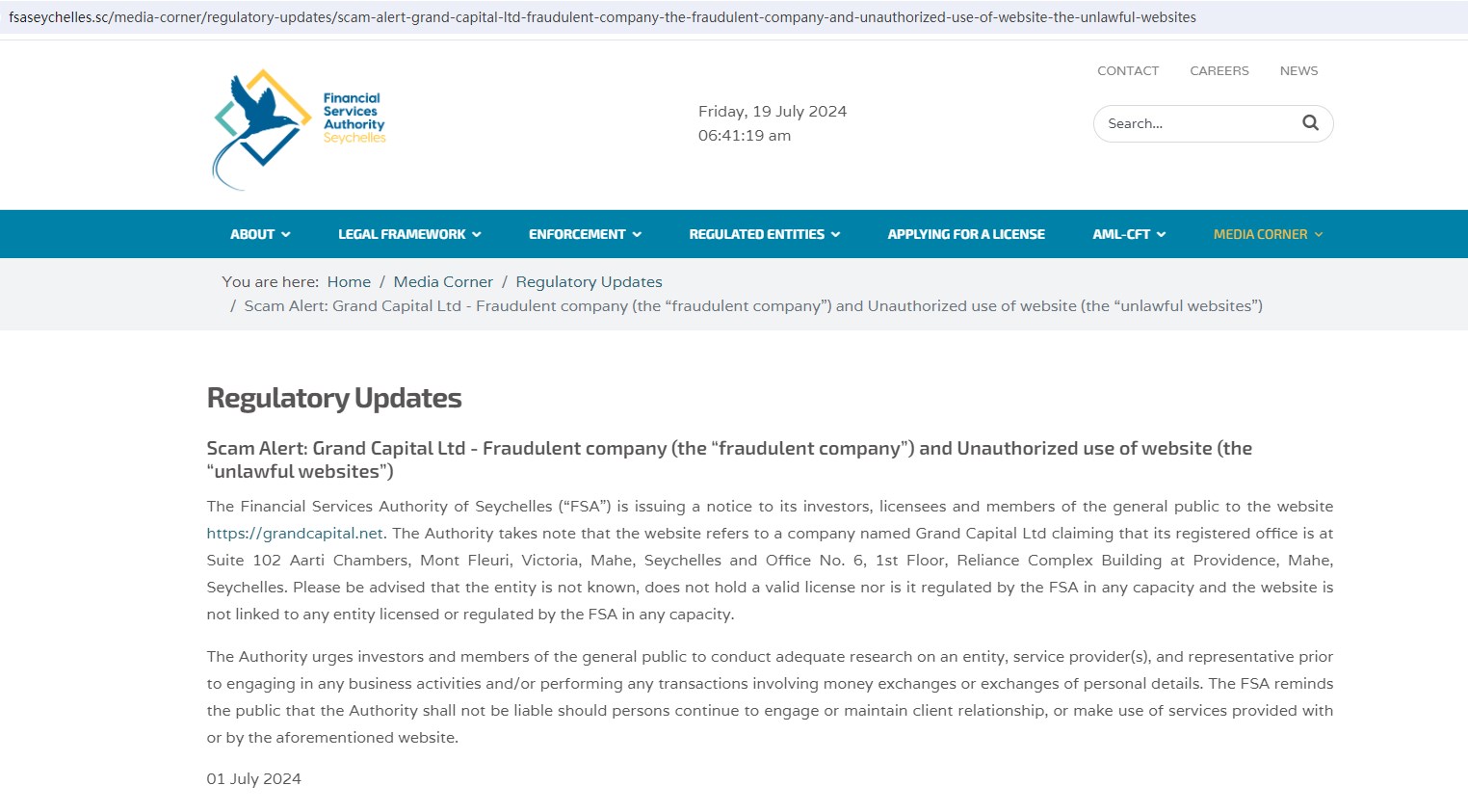 On 22 Apr 2024, the Seychelles Financial Services Authority (Seychelles FSA) issued a warning that Grand Capital Ltd (https://grandcapital.net) was an unlawful website. You may visit: https://fsaseychelles.sc/media-corner/regulatory-updates/scam-alert-grand-capital-ltd-fraudulent-company-the-fraudulent-company-and-unauthorized-use-of-website-the-unlawful-websites.