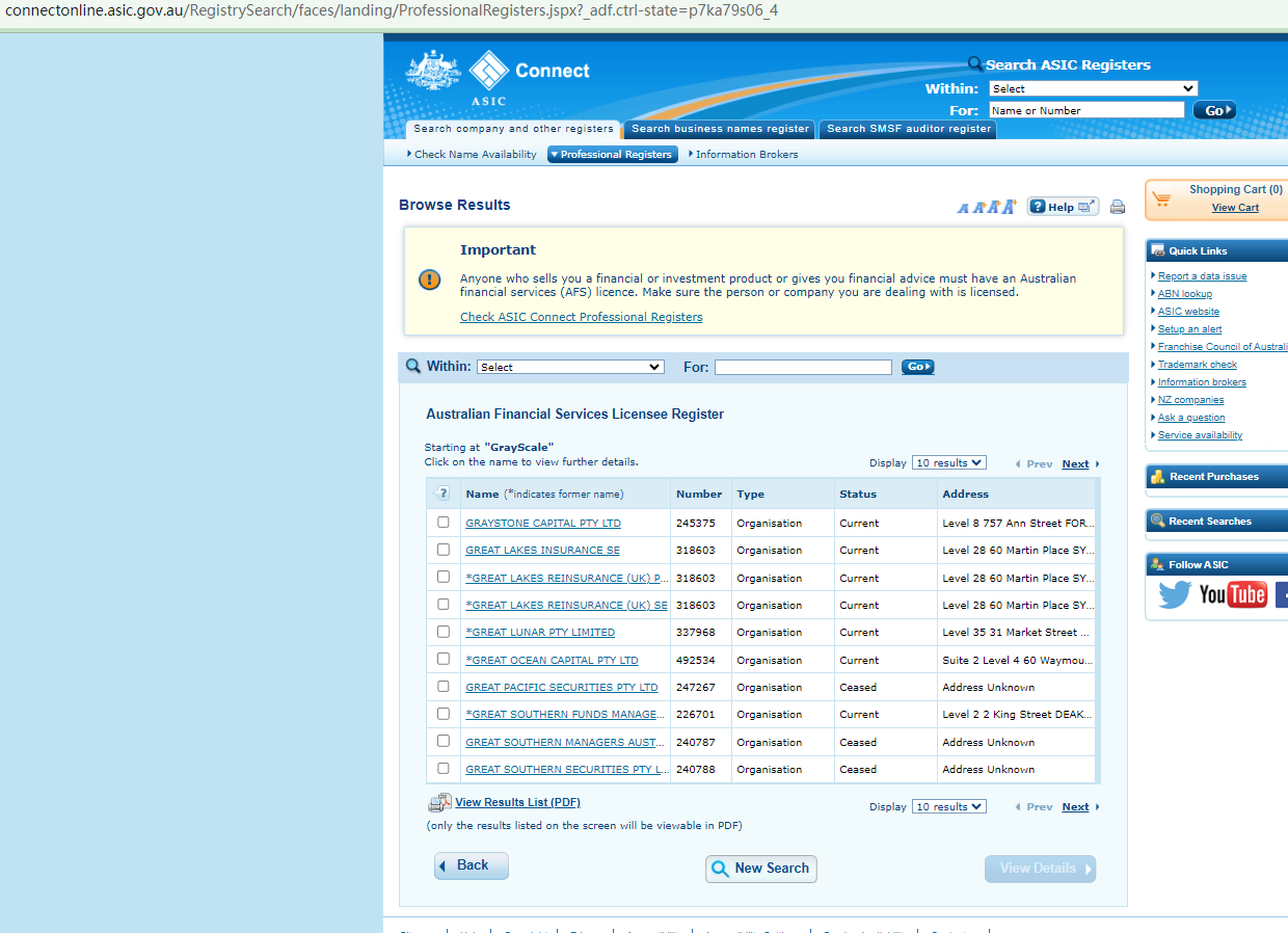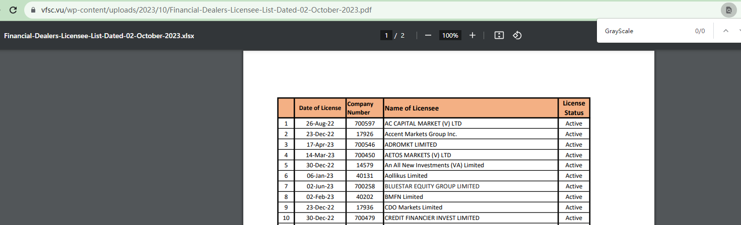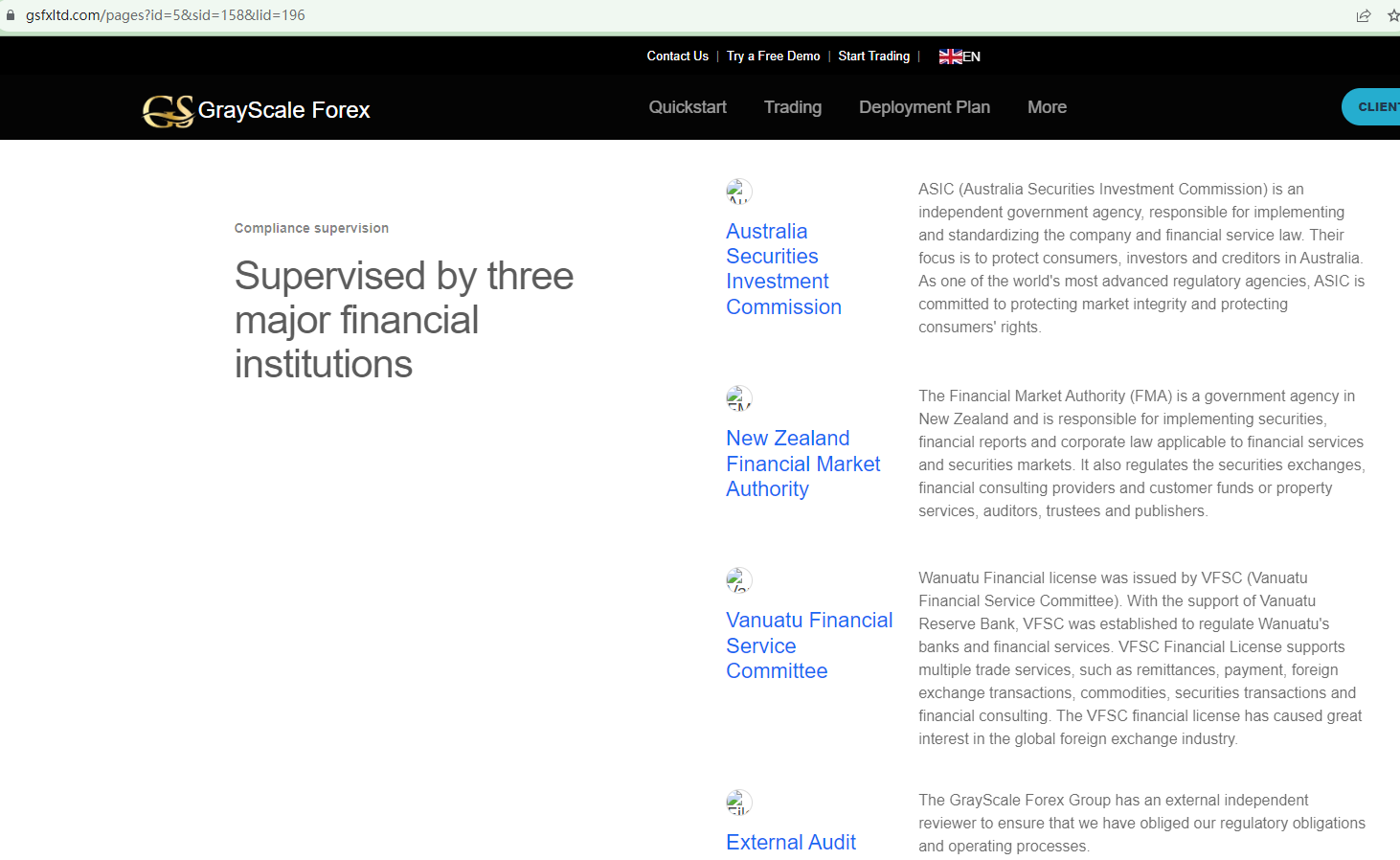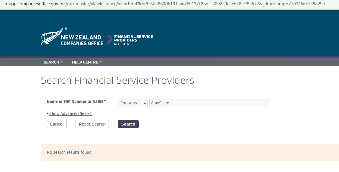 The claim that GrayScale Forex is registered with and licensed by many regulatory bodies, including the National Futures Association (NFA), the Australian Securities and Investments Commission (ASIC), the New Zealand Financial Markets Authority (NZ FMA), the Vanuatu Financial Services Commission (VFSC), and the Seychelles Financial Services Authority (Seychelles FSA), is false as our extensive searches through these regulators' registers have failed to yield any evidence of its legitimacy.