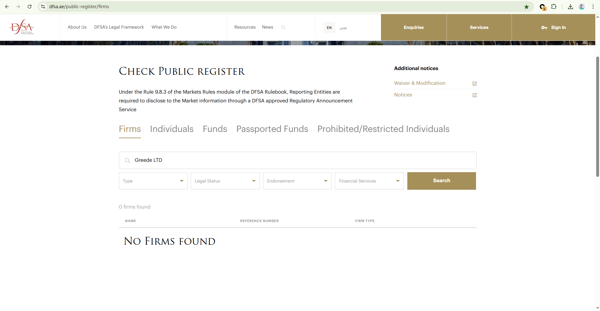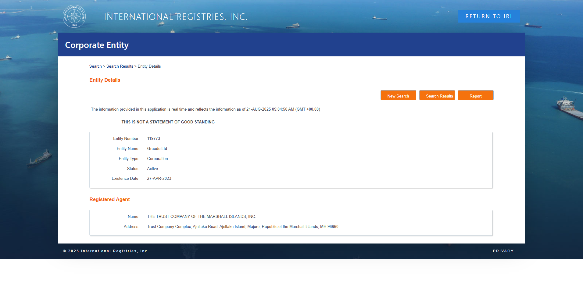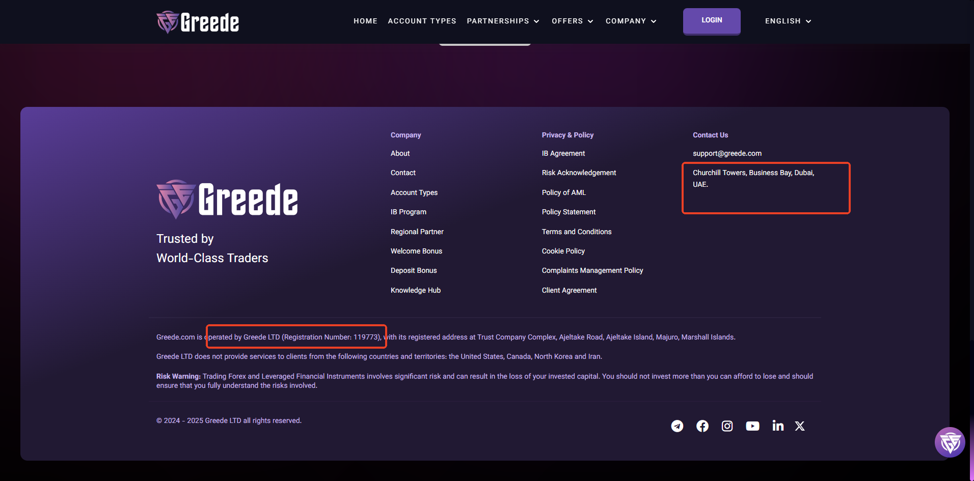 Greede claims to be registered in the Marshall Islands, and while we found that it is indeed registered with the Marshall IRI, please note that the Marshall IRI is not a government agency nor a regulator, and it does not regulate foreign exchange. Additionally, Greede claims to have a physical presence in Dubai, but we were unable to find any regulatory information for this company with either the DFSA or the SCA. Therefore, this platform is unregulated and has a very high likelihood of being a scam.
