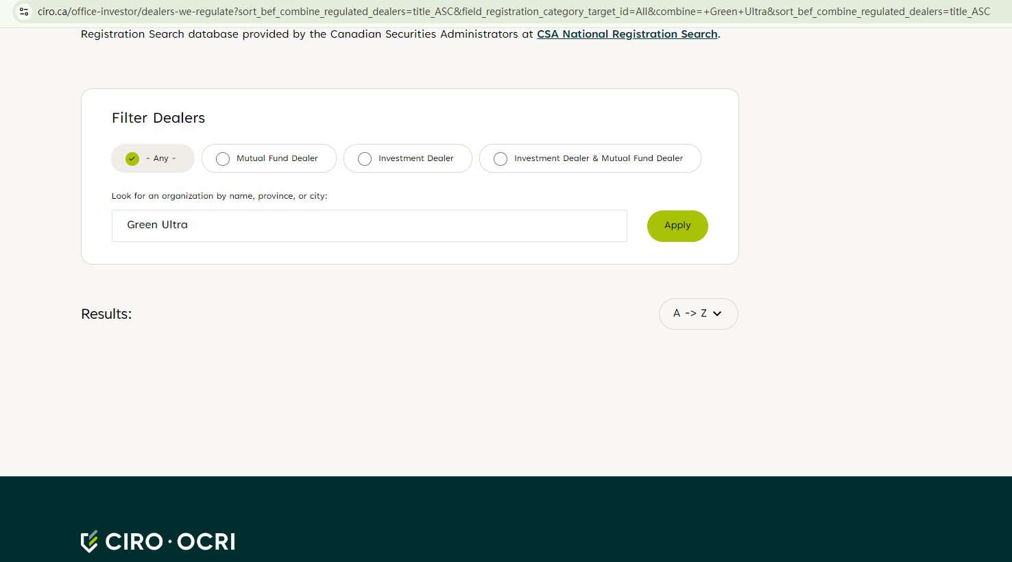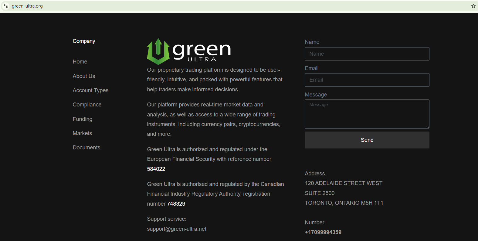 In the website footer, Green Ultra claims to be authorized by the European Financial Security and the Canadian Financial Industry Regulatory Authority. However, no such authorities exist. The link attached to the license number allegedly issued by the European Financial Security directs to the page of FISEU, a fake authority flagged by the German financial regulator, BaFin. Additionally, our search for the company in the register of the Investment Industry Regulatory Organization of Canada (IIROC) yielded no matching records, indicating that the company is not authorized in Canada. In conclusion, the regulatory claims are fake.