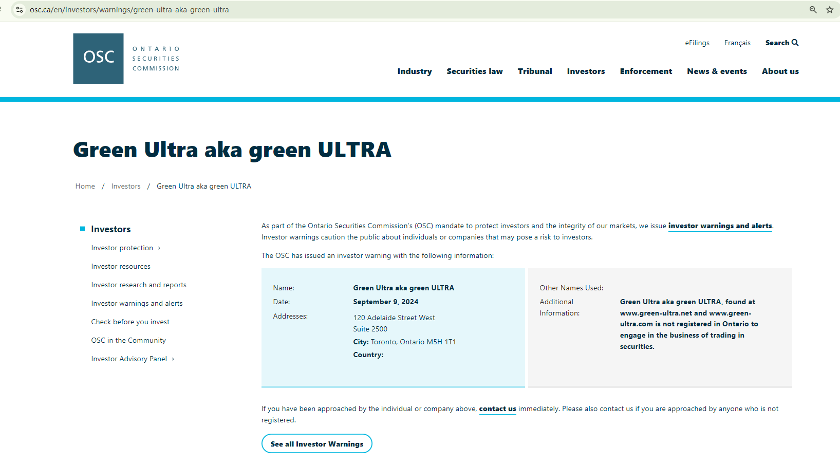 What's more, the Ontario Securities Commission (OSC) has issued a warning against Green Ultra, stating that this broker is not registered in Ontario to engage in the business of trading in securities.