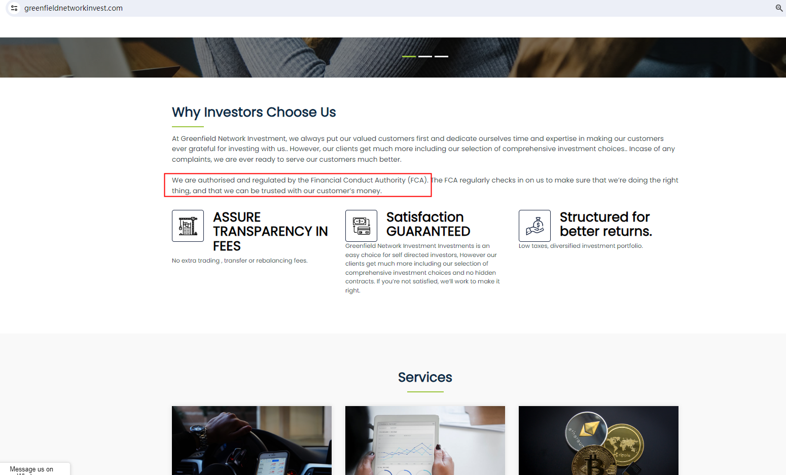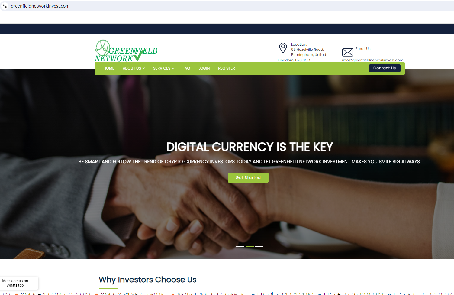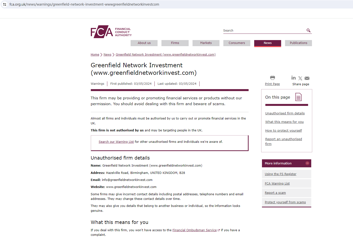 On May 3rd, 2024, the Financial Conduct Authority (FCA) issued a warning against Greenfield Network Investment, believing this company might be providing financial services or products without proper authorization in the UK. https://www.fca.org.uk/news/warnings/greenfield-network-investment-wwwgreenfieldnetworkinvestcom
