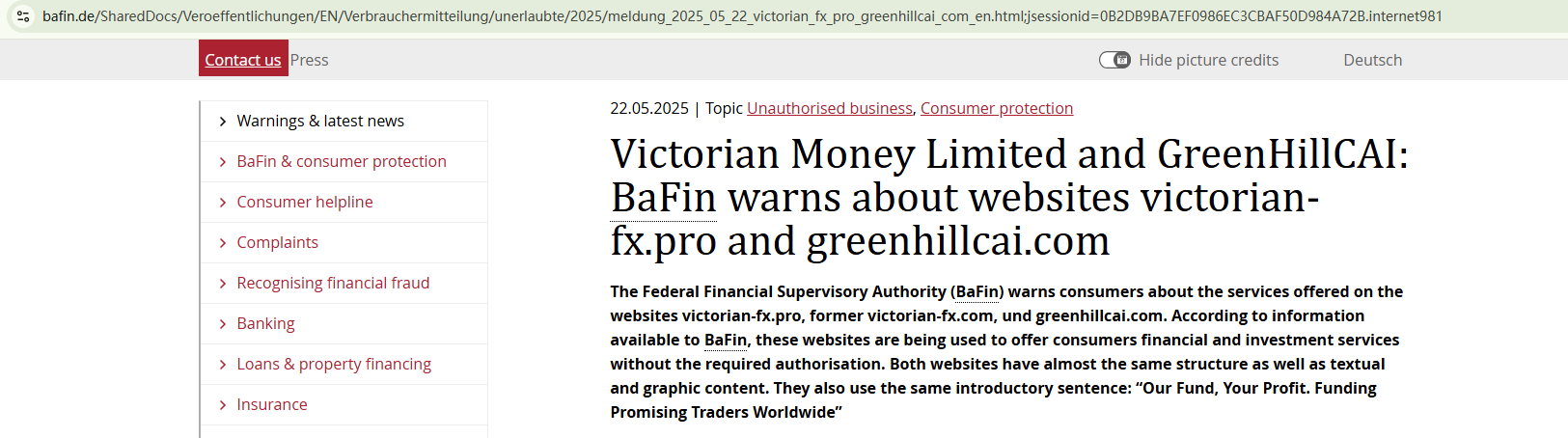 On May 22, 2025, the Federal Financial Supervisory Authority (BaFin) issued a warning against GreenHillCAI for the lack of the required authorization. https://www.bafin.de/SharedDocs/Veroeffentlichungen/EN/Verbrauchermitteilung/unerlaubte/2025/meldung_2025_05_22_victorian_fx_pro_greenhillcai_com_en.html;jsessionid=0B2DB9BA7EF0986EC3CBAF50D984A72B.internet981