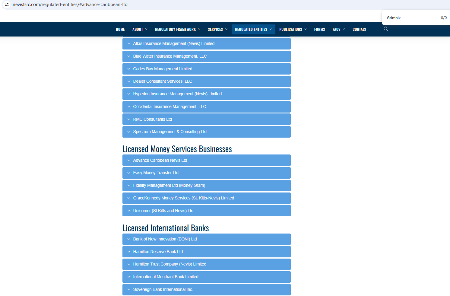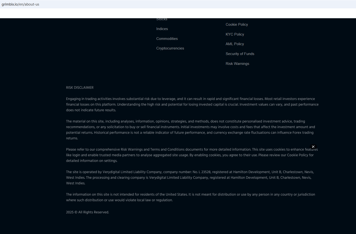 According to its website, it is located in Nevis. Upon investigation, no matching information was found in the Nevis Financial Services Regulation and Supervision Department (NFRSD). In addition, the Financial Conduct Authority (FCA) issued a warning against Grimbix, believing this company might be providing financial services or products without proper authorization in the UK.