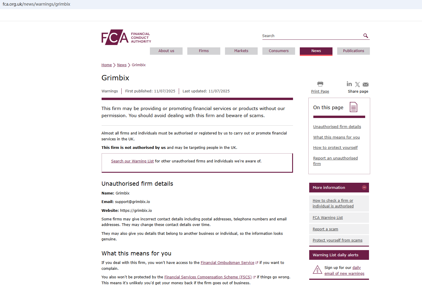 On July 11, 2025, the Financial Conduct Authority (FCA) issued a warning against Grimbix, believing this company might be providing financial services or products without proper authorization in the UK. https://www.fca.org.uk/news/warnings/grimbix