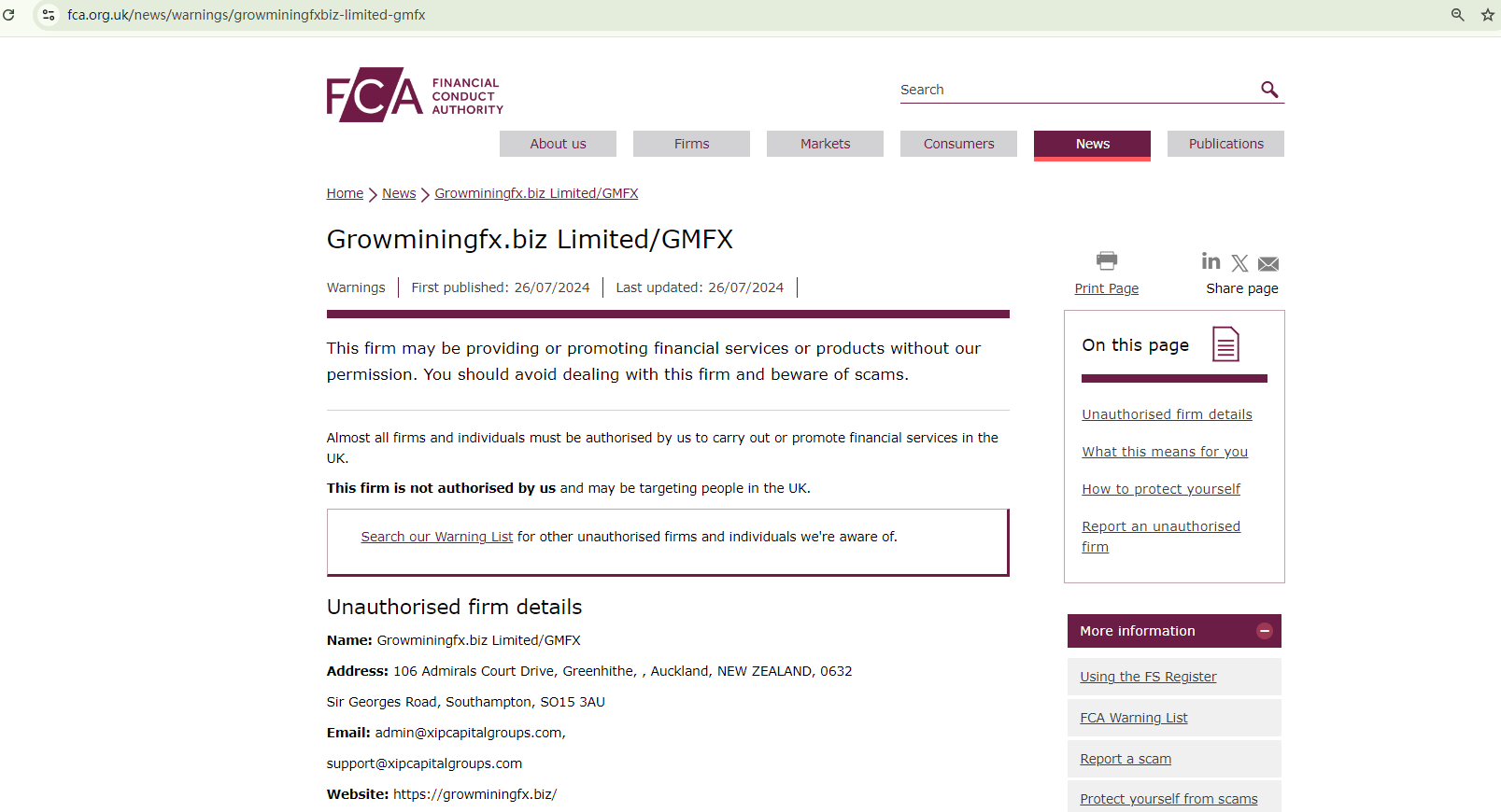 On July 26, 2024, the Financial Conduct Authority (FCA) issued a warning against Growminingfx.biz Limited (GMFX), believing this company might be providing financial services or products without proper authorization in the UK. https://www.fca.org.uk/news/warnings/growminingfxbiz-limited-gmfx