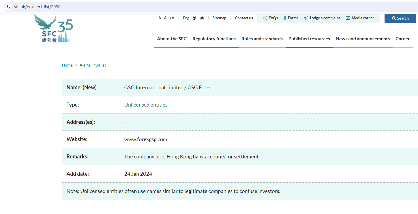 On 24 January 2024, the HONG KONG Securities and Futures Commission (HK SFC) issued a warning that GSG Forex was providing financial services or products without authorisation. You may visit: https://www.sfc.hk/en/alert-list/2990