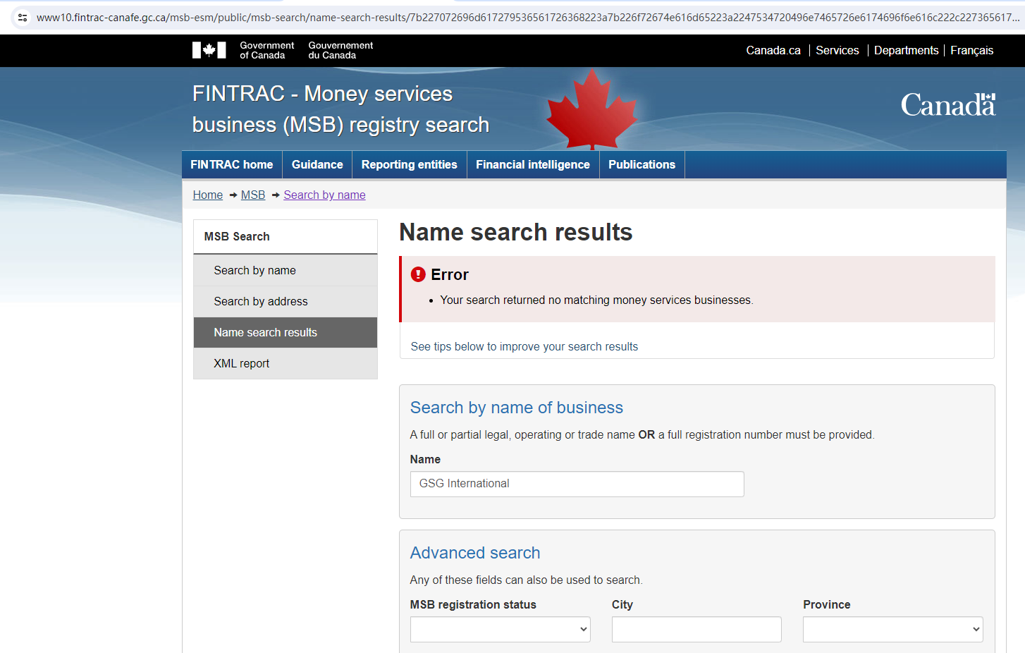 GSG Forex claims to be regulated by the Financial Transactions and Reports Analysis Centre of Canada (FINTRAC) (MSB number: M2057034), we searched the FINTRAC by its company name but found no matching results.
