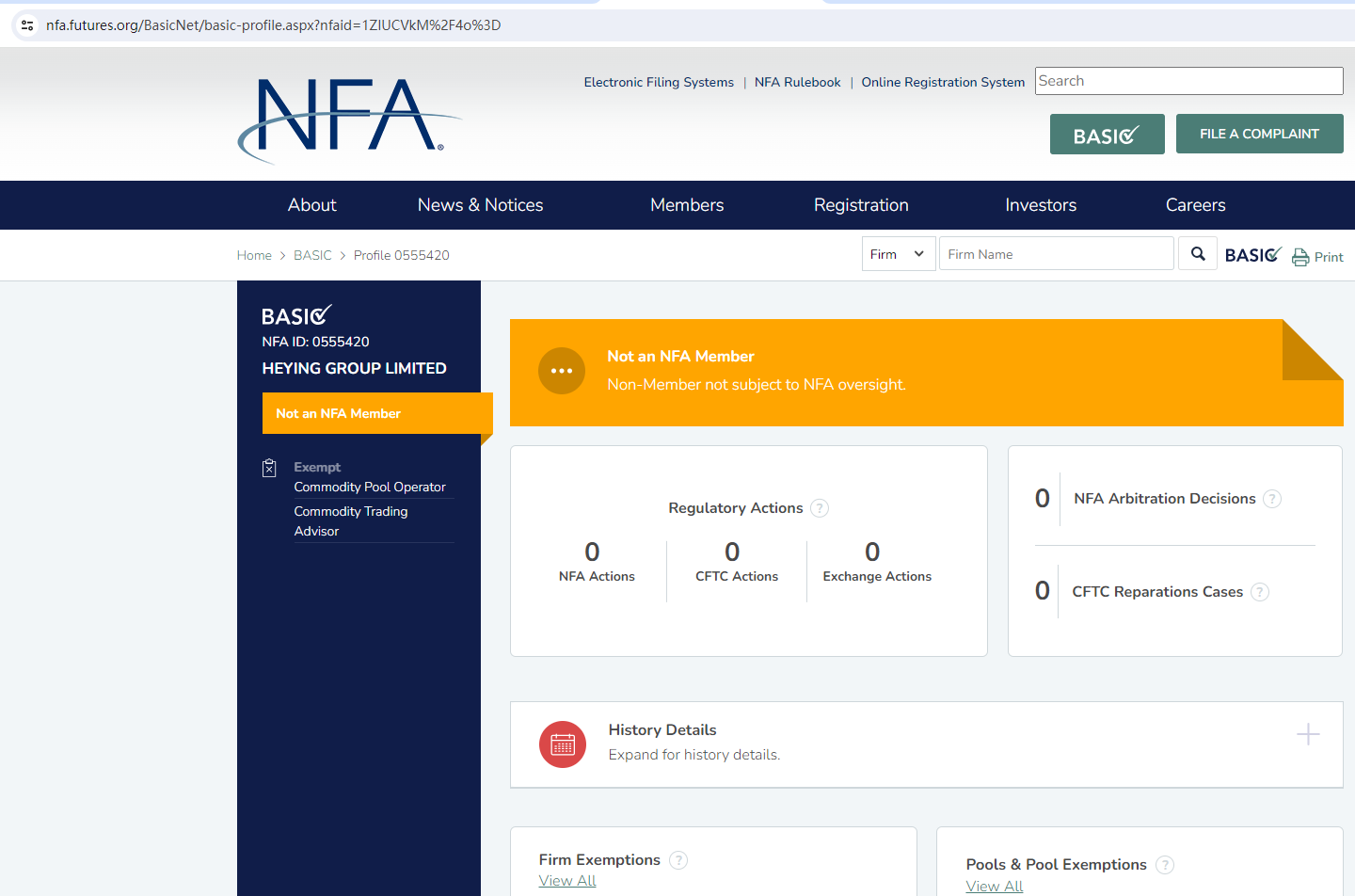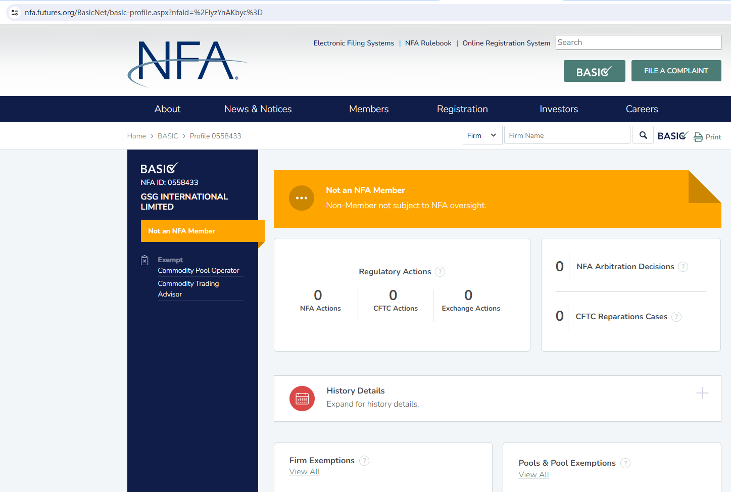 GSG Forex claims to be regulated by the National Futures Association (NFA) (NFA ID: 0555420/0558433), we searched by NFA ID 0555420 but found a mismatch for one company HEYING GROUP LIMITED, when we searched by NFA ID 0558433 there was a matching result. But GSG INTERNATIONAL LIMITED is not an NFA member and thus not subject to the regulator's oversight. Its NFA ID is only for tracking purposes only.