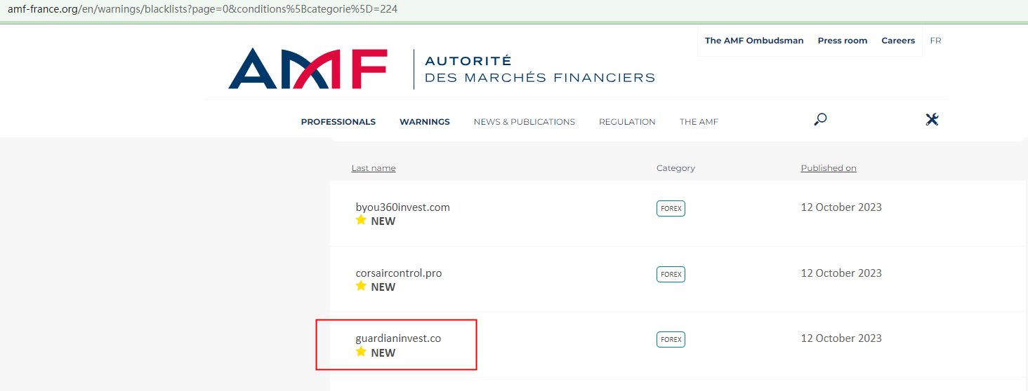 On October 12, 2023, the Financial Authority (Autorité des Marchés Financiers, AMF) added Guardian Invest to warning list for it being an unauthorized company engaging in forex activities. https://www.amf-france.org/en/warnings/blacklists?page=0&conditions%5Bcategorie%5D=224