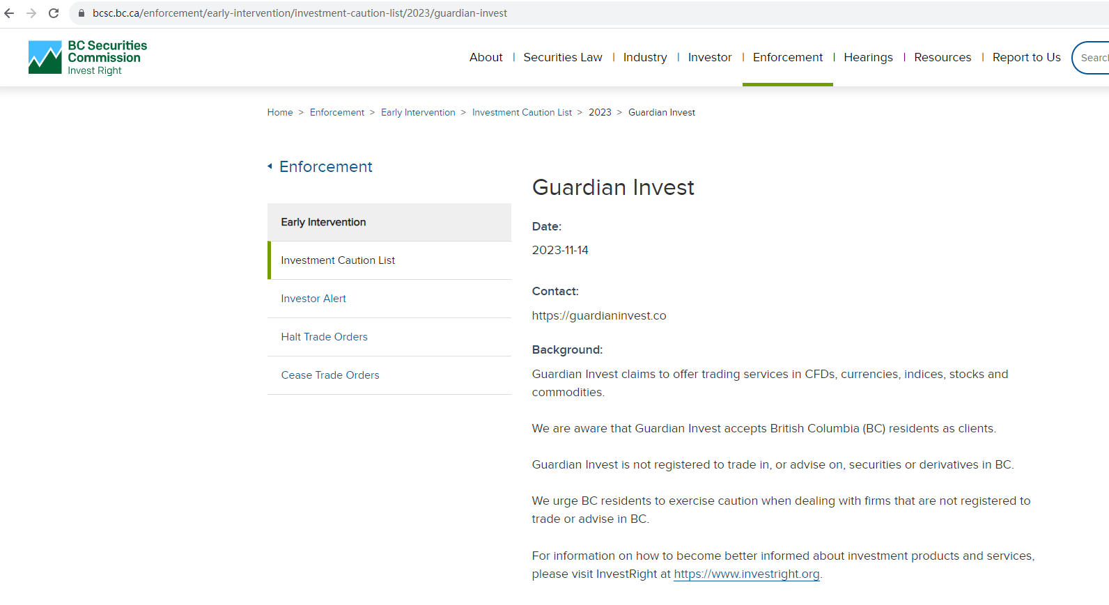 On 14 November 2023, the British Columbia Securities Commission (BCSC) issued a warning that Guardian Invest was providing financial services or products without authorisation. You may visit: https://www.bcsc.bc.ca/enforcement/early-intervention/investment-caution-list/2023/guardian-invest