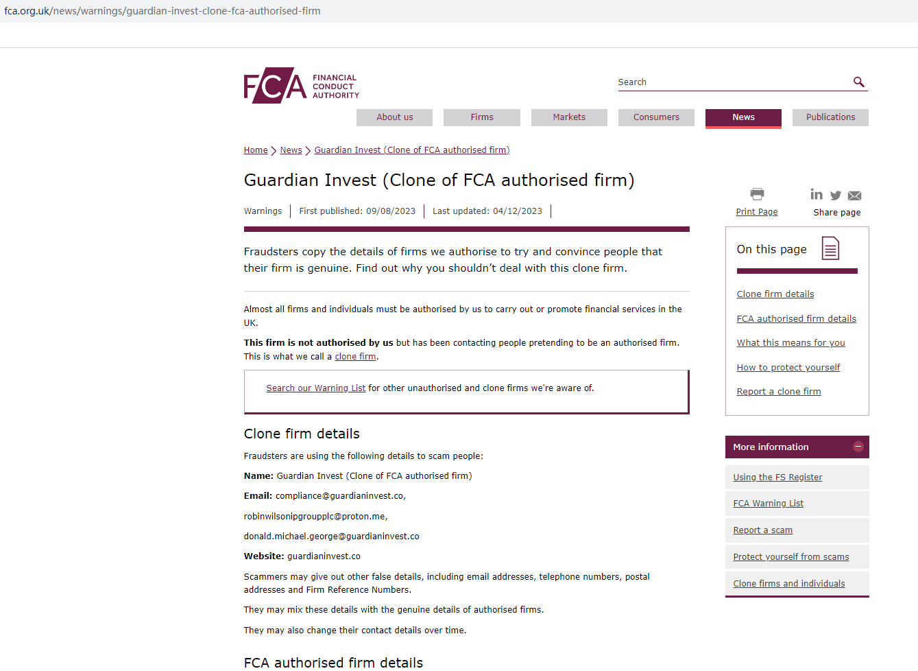 On August 9, 2023, the Financial Conduct Authority (FCA) issued a warning against Guardian Invest, identifying this broker as a clone of an FCA-authorized firm. https://www.fca.org.uk/news/warnings/guardian-invest-clone-fca-authorised-firm