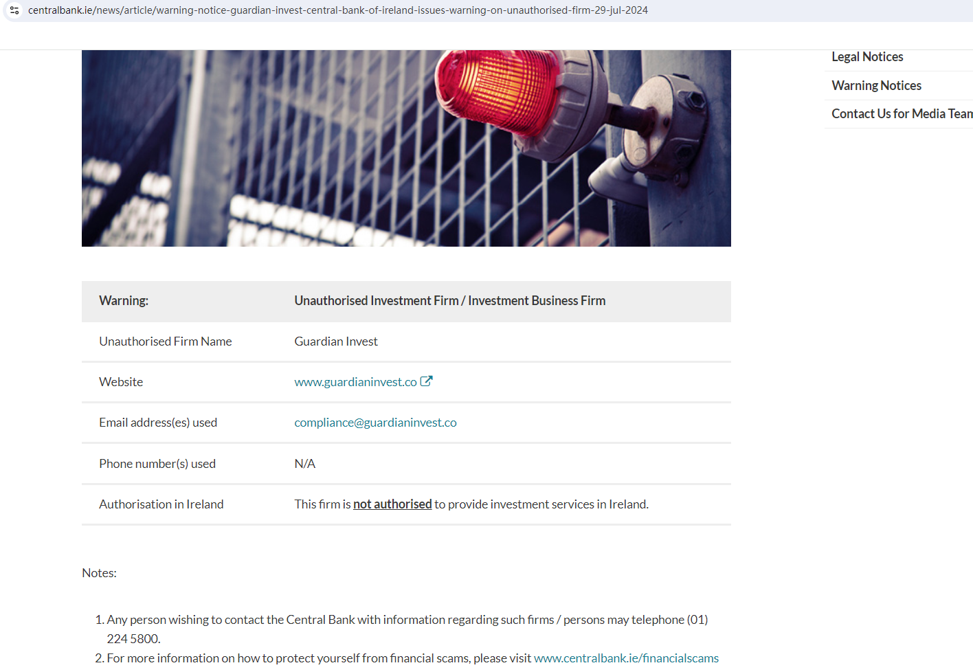 On March 15, 2024, the The Central Bank of Ireland (CBI) warns consumers about the company Guardian Invest and the services it is offering, suspecting the unknown operators of offering consumers financial and investment services on the website www.guardianinvest.co without the required authorization. https://www.centralbank.ie/news/article/warning-notice-guardian-invest-central-bank-of-ireland-issues-warning-on-unauthorised-firm-29-jul-2024