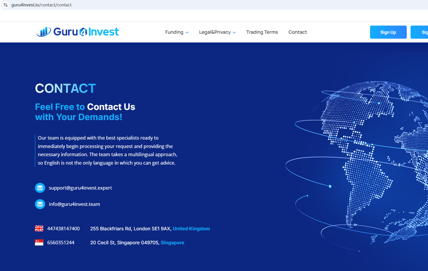 According to its website, it claims to have offices in the United Kingdom and Singapore. Upon investigation, no matching information was found in the Financial Conduct Authority (FCA) and the Monetary Authority of Singapore (MAS).