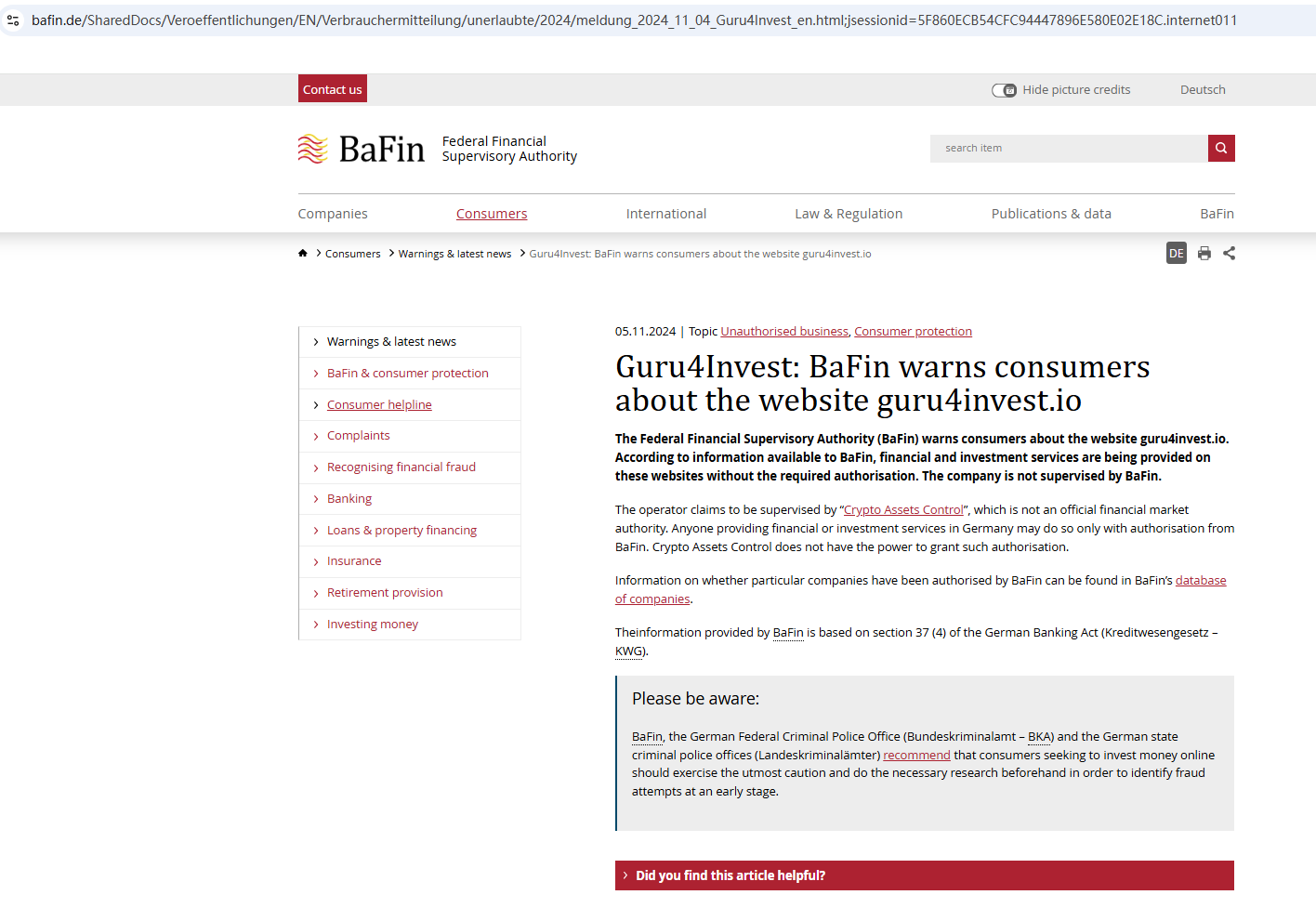 On November 5, 2024, the Federal Financial Supervisory Authority (BaFin) warned consumers about the services offered by the company Guru4Invest (guru4invest.io), which is offering financial and investment services without the required authorization. https://www.bafin.de/SharedDocs/Veroeffentlichungen/EN/Verbrauchermitteilung/unerlaubte/2024/meldung_2024_11_04_Guru4Invest_en.html;jsessionid=5F860ECB54CFC94447896E580E02E18C.internet011