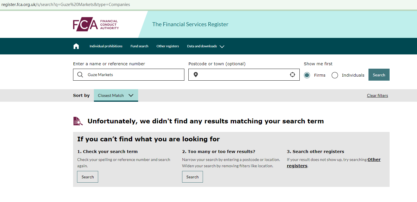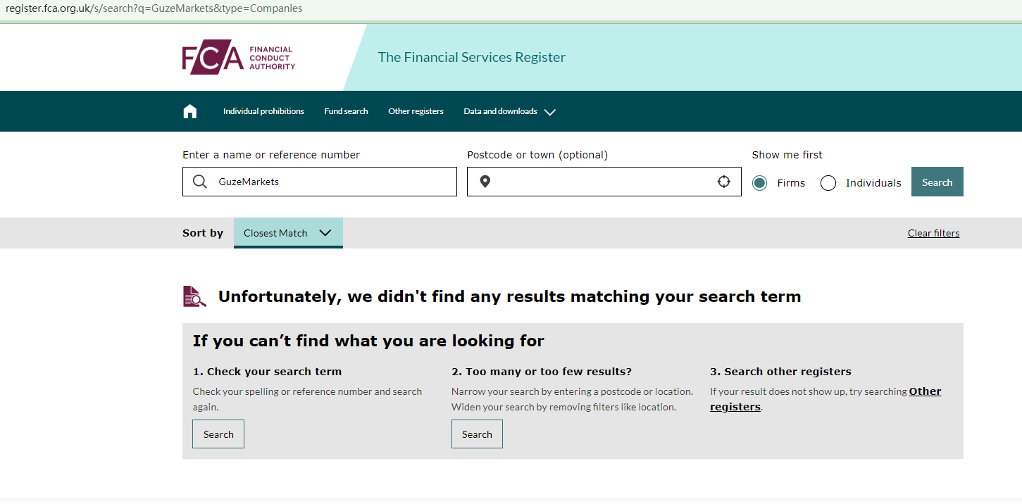 Additionally, Guze Markets alleges to have an address in the UK, which prompted a search in the Financial Conduct Authority (FCA). Yet, no corresponding records were found in the register.