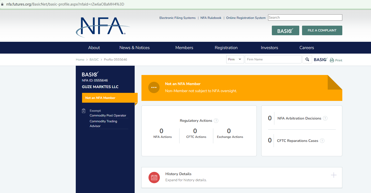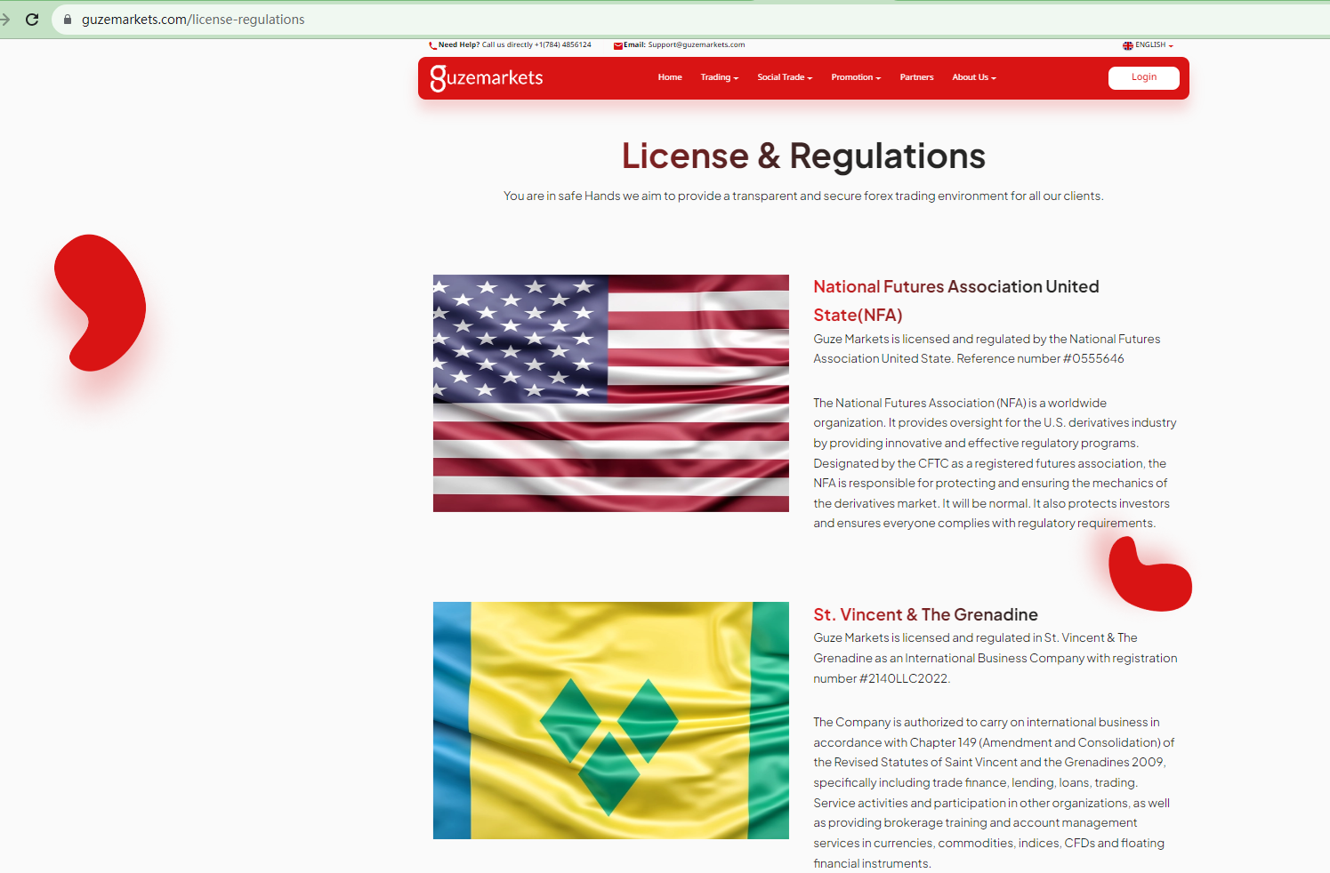 Guze Markets presents itself as a licensed forex broker, claiming to possess an ID ("0555646") issued by the National Futures Association (NFA) and a registration number 2140LLC2022 from the Financial Services Authority of St. Vincent and the Grenadines (SVG FSA).