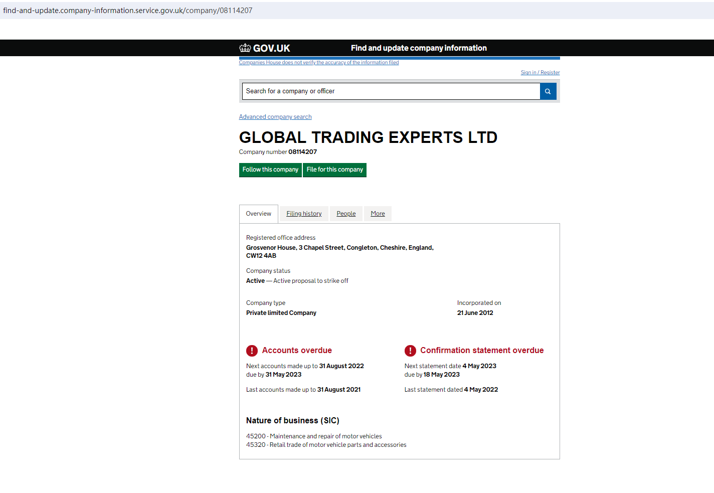 According to its website, it claims registered in the Company House (CH) with registration number: 08114207. Upon investigation, we found that the status shows "Overdue". In addition, no matching information was found in the Financial Conduct Authority (FCA). Because CH registration does not equal authorization by a financial institution, GXOTE is an illegal platform that provides financial services in the UK without a license..
