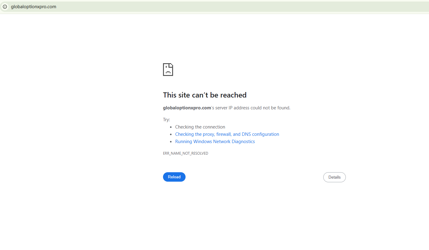 BrokersView found that the domain "https://globaloptionxpro.com/" is currently inaccessible. This is widely regarded as a significant red flag, as the suspension of a broker's website often points to underlying regulatory or operational issues.