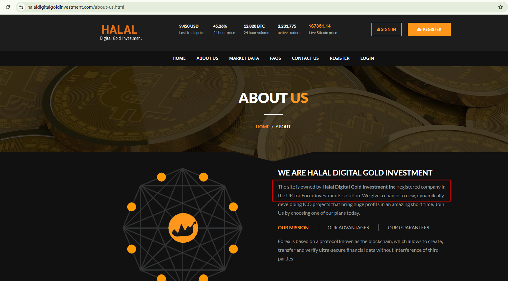 HALAL DIGITAL GOLD INVESTMENT asserts that it is registered as Forex Explore Limited, with a purported company number of 11188393. Given its claimed location in the UK, it is assumed that the company number is registered with the Companies House (CH). However, this number in the CH register corresponds to a company called Bitcoin Explore Limited, which has been dissolved. This discrepancy raises questions about the authenticity and credibility of HALAL DIGITAL GOLD INVESTMENT.