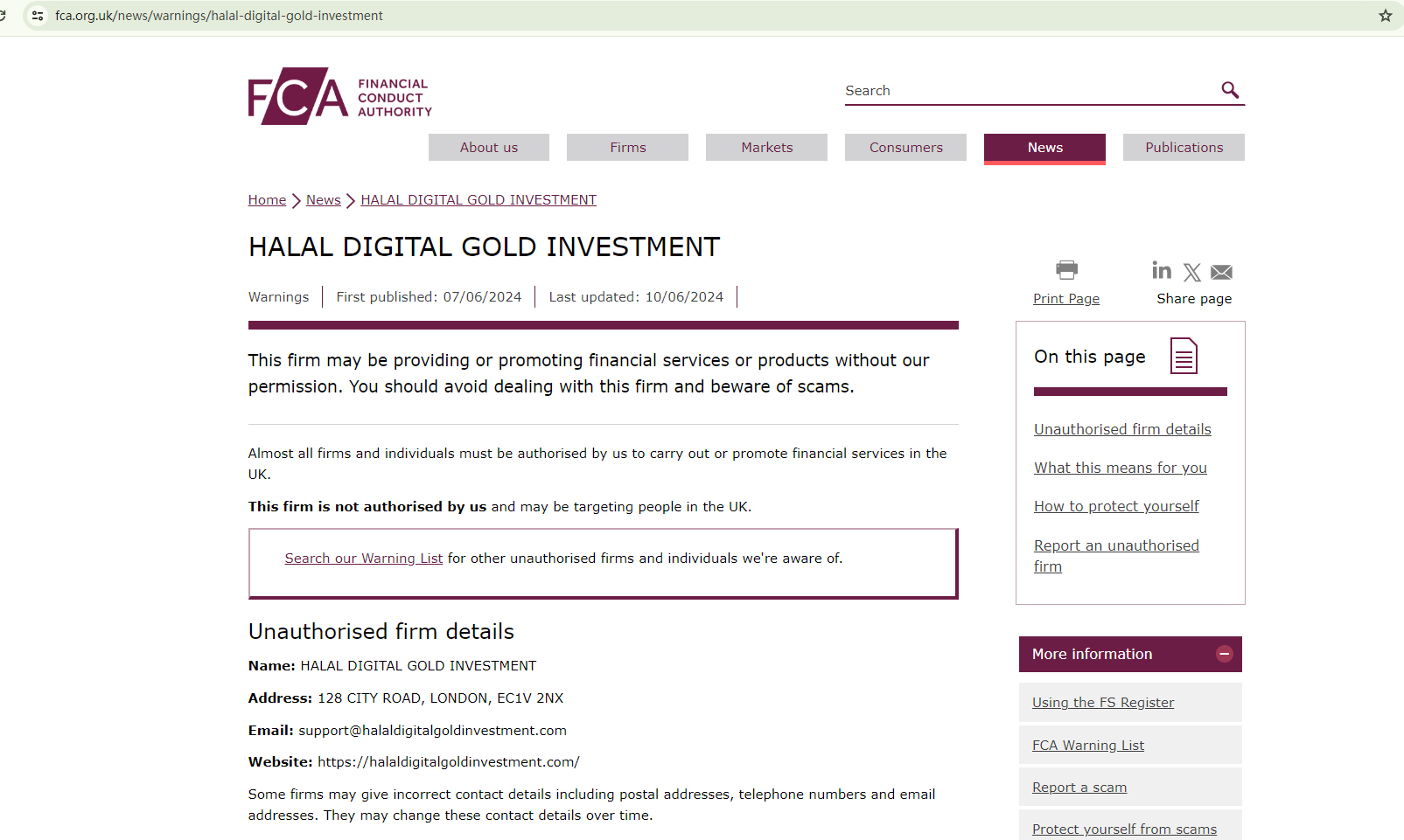 On June 10, 2024, the Financial Conduct Authority (FCA) issued a warning against HALAL DIGITAL GOLD INVESTMENT for the lack of authorization. https://www.fca.org.uk/news/warnings/halal-digital-gold-investment