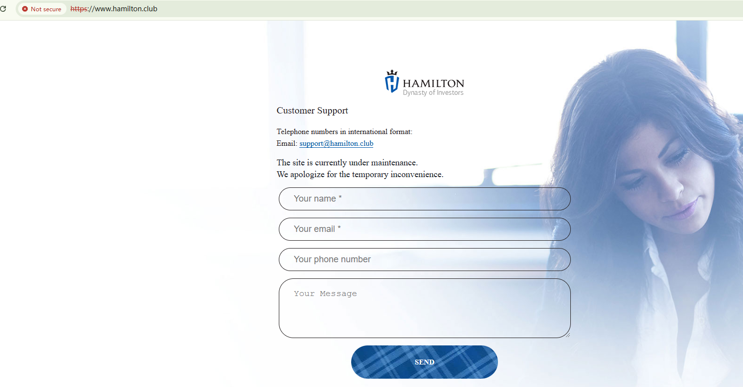 Hamilton's website is currently inaccesible, claiming to be under maintenance. Our investigation suggests that the alleged registration with the Financial Services Authority of St. Vincent and The Grenadines (SVG FSA) has been canceled, which the broker used to demonstrate its legitimacy and compliance.