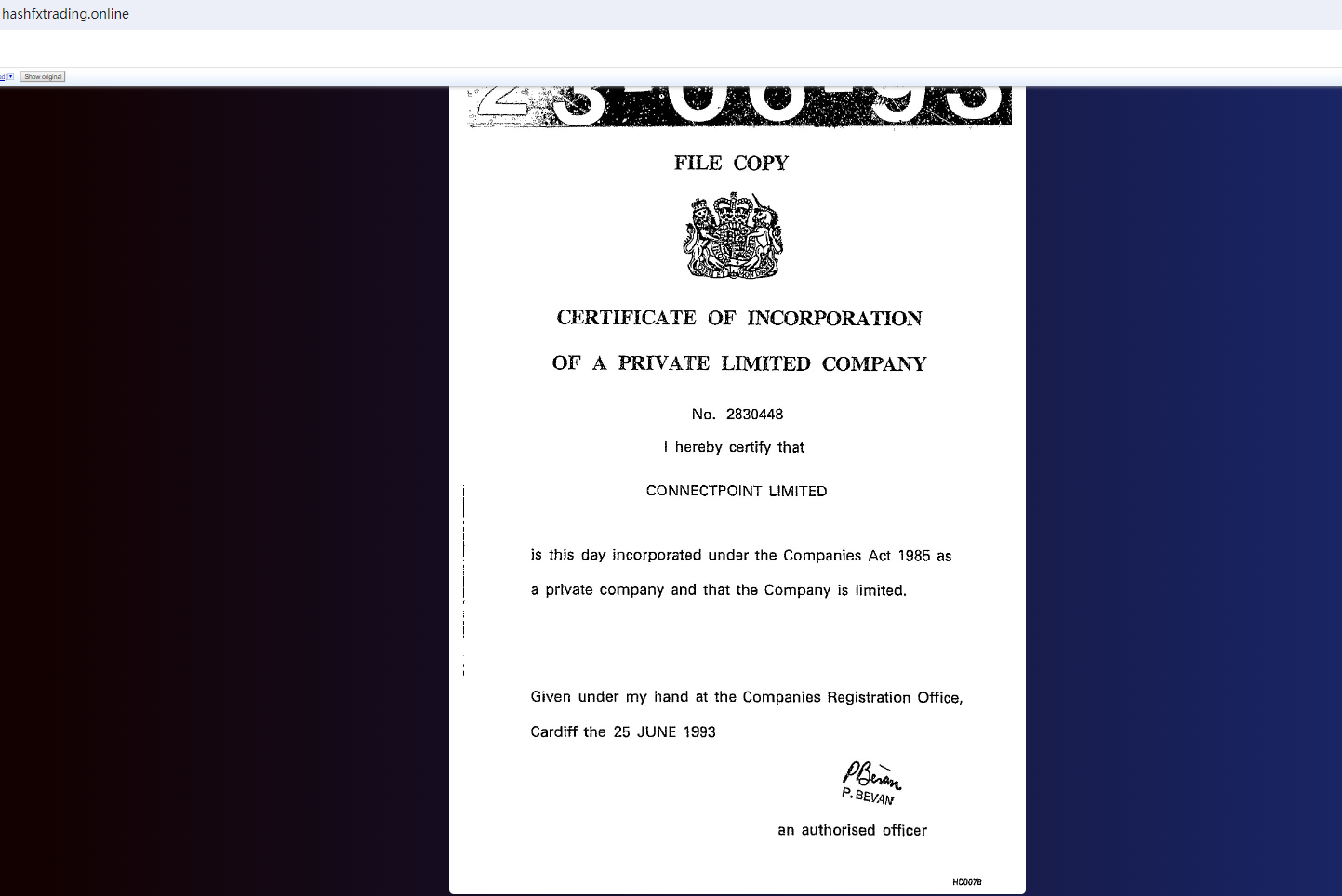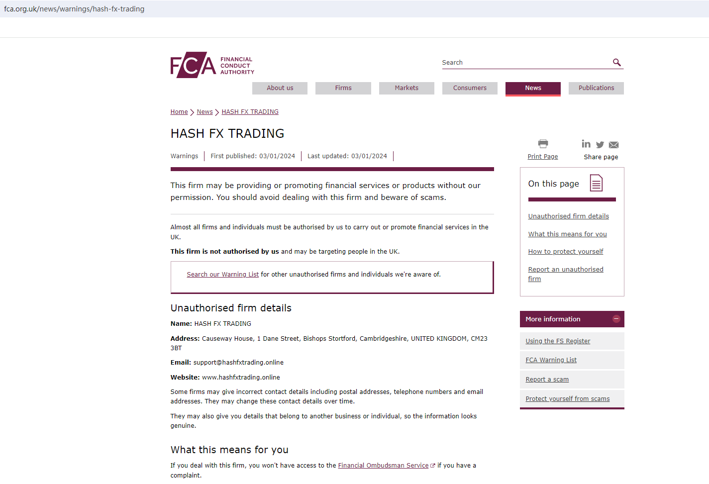 Furthermore, it displayed a Company House (CH) certificate on its website. Upon investigation, it was found that this certificate was also stolen from another entity, and the status of the certificate was "Overdue". At the same time, the United Kingdom Financial Conduct Authority (UK FCA) issued a warning that HASH FX TRADING was providing financial services or products in the UK without authorisation.