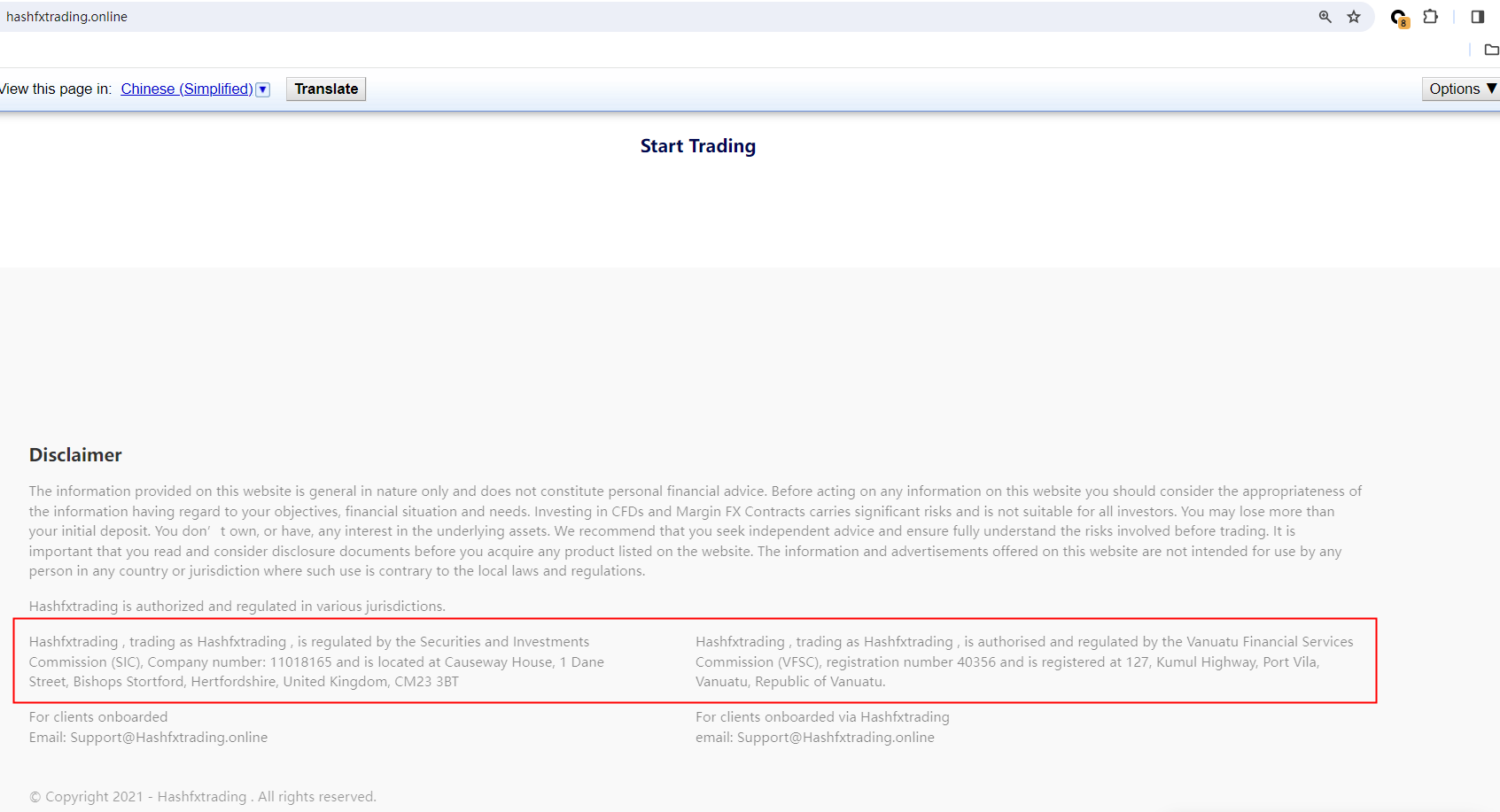 According to its website, it claims that it is regulated by the Vanuatu Financial Services Commission (VFSC), and its registration number is 40356. Upon investigation, it was found that the company matching the regulatory number 40356 is called "Trademax Global Limited". Obviously, Hashfxtrading has stolen the names of other legitimate broker's regulatory information. In addition, it claimed that it was regulated by the Securities and Investments Commission (SIC), with company number: 11018165 and an address in the United Kingdom. However, after inquiries, the agency was not found in the United Kingdom. Obviously, this is false information, it is intended to mislead others.