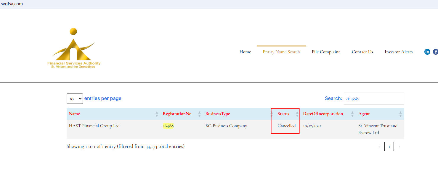It does not display any valid regulatory information or office address on its website, and the previously stated Financial Services Authority (SVG FSA) registration status is "Cancelled". All these signs indicate that HAST Forex faces significant risks. Investors should monitor developments and remain vigilant.