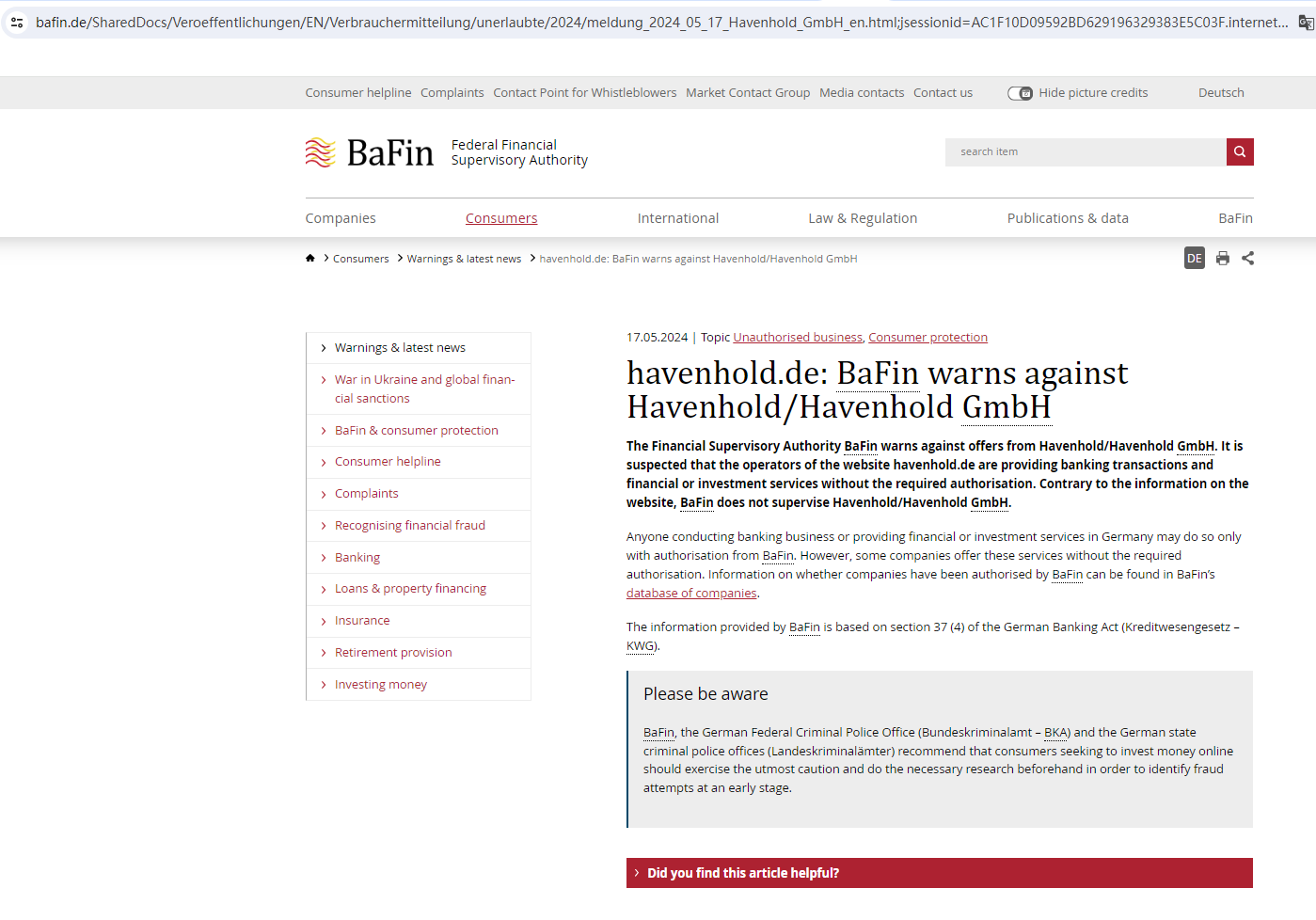 The Federal Financial Supervisory Authority (BaFin) warned consumers about the services offered by the company Havenhold/Havenhold GmbH, which is offering financial and investment services without the required authorization.