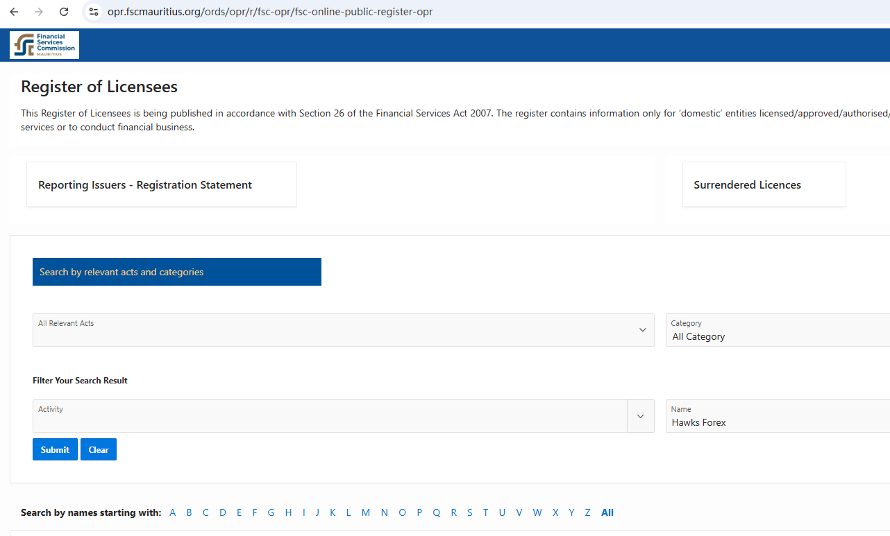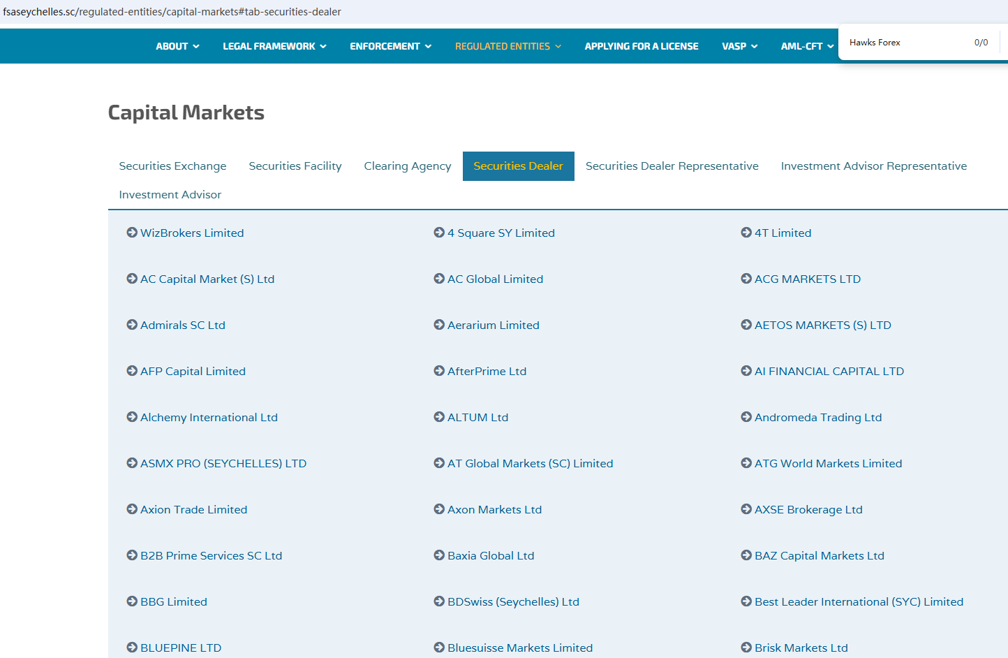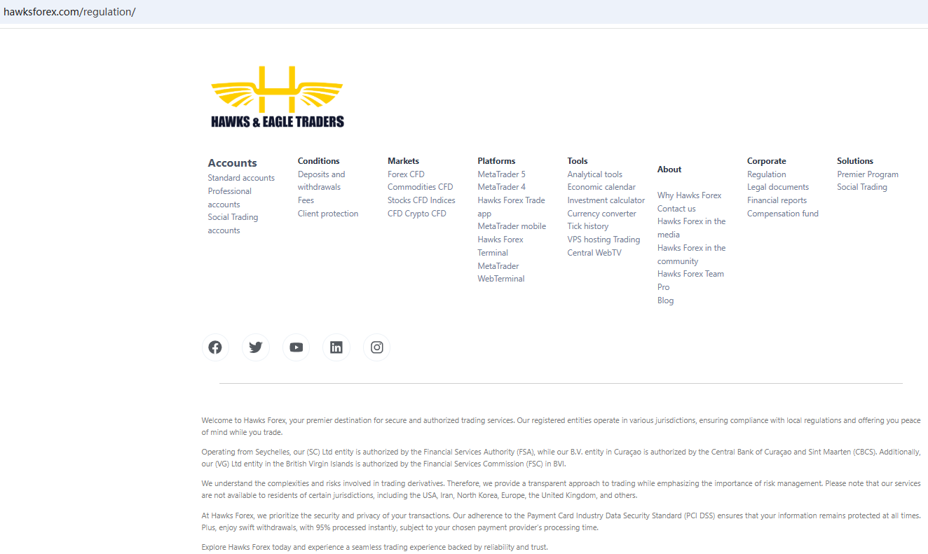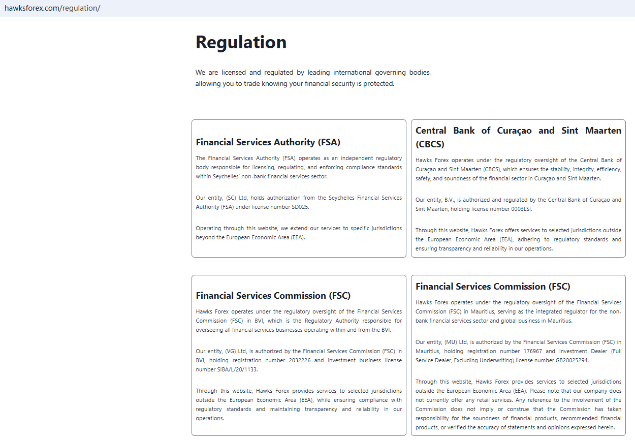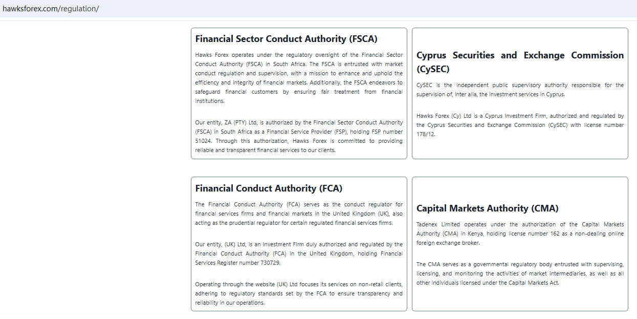 Hawks Forex claims to be a online broker licensed and regulated by leading international governing bodies, including the Seychelles Financial Services Authority (FSA), the Central Bank of Curaçao and Sint Maarten (CBCS), the Financial Services Commission (FSC) in BVI, the Financial Services Commission (FSC) in Mauritius, the Financial Sector Conduct Authority (FSCA) in South Africa with FSP number 51024, the Cyprus Securities and Exchange Commission (CySEC) with license number 178/12, the Financial Conduct Authority (FCA) in the United Kingdom with register number 730729, the Capital Markets Authority (CMA) in Kenya, offering a range of investment products to traders in global markets.