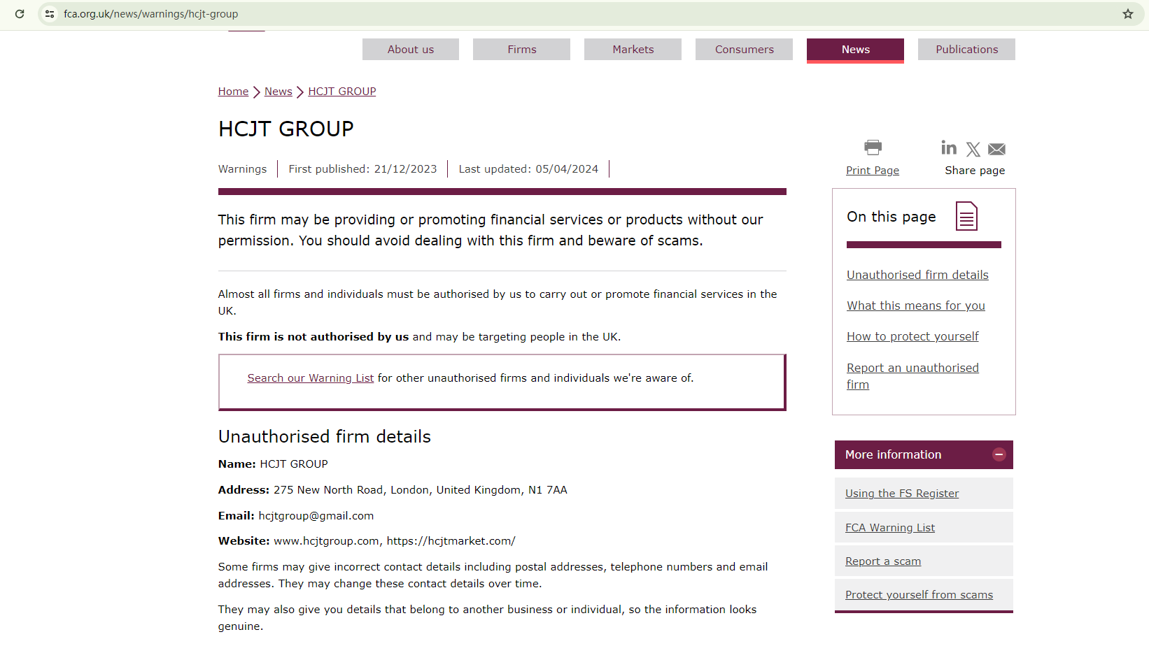 On April 5, 2024, the Financial Conduct Authority (FCA) issued a warning against HCJT Group, believing this company might be providing financial services or products without proper authorization in the UK. https://www.fca.org.uk/news/warnings/hcjt-group