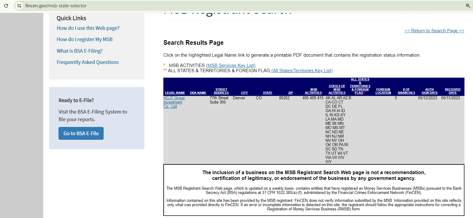 While HCJT Group purports to be a broker based in London and holds an MSB registration with the Financial Crimes Enforcement Network (FinCEN), our investigation indicates that it is an unlicensed broker.