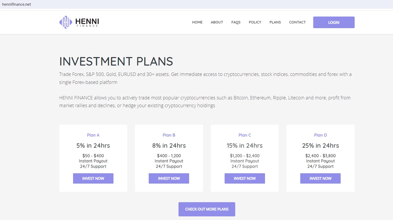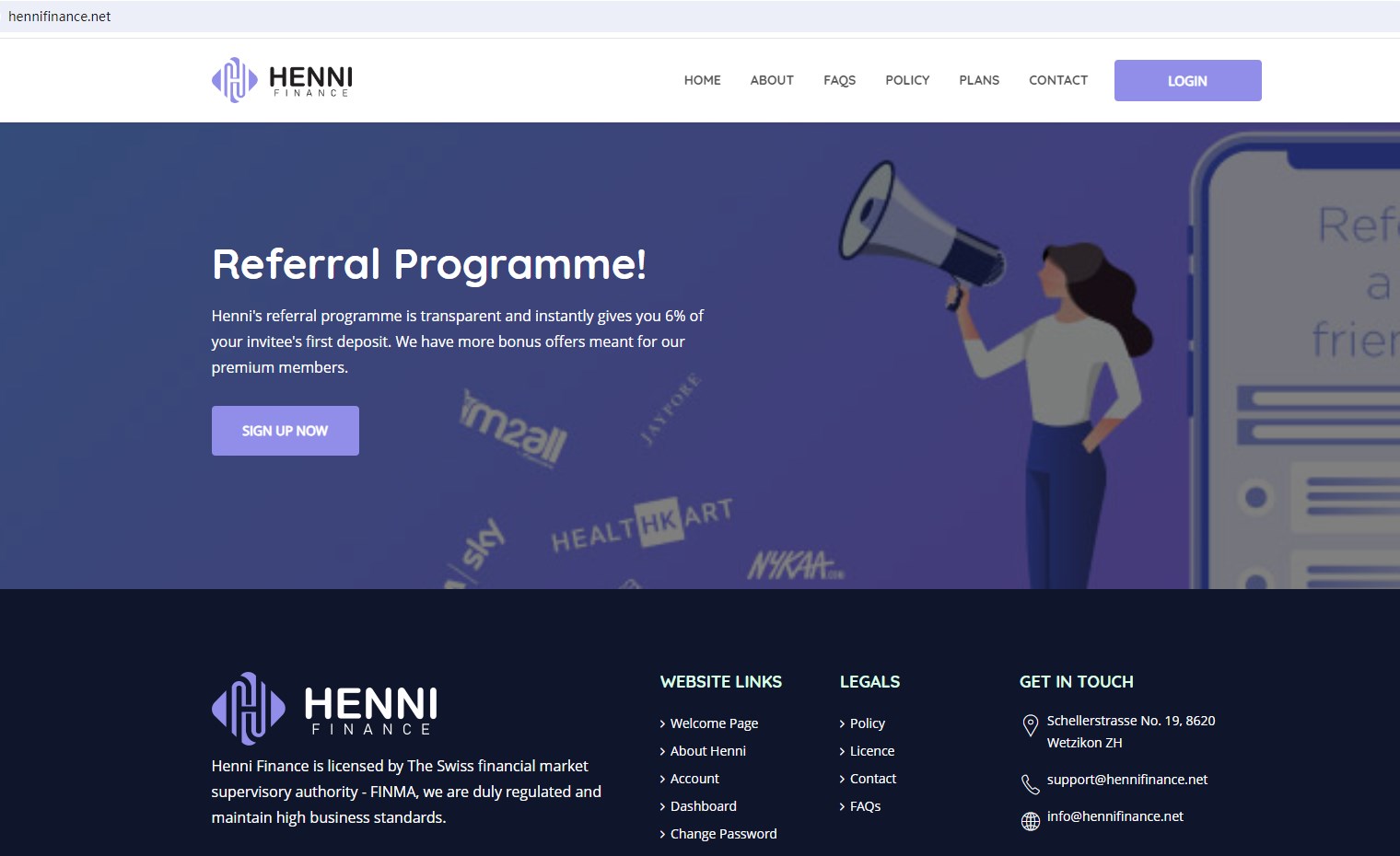 Henni Finance claims to be licensed by the the Swiss Financial Market Supervisory Authority (FINMA), offering wide range of financial services, including Cryptocurrencies, Stock, Indices, Commodities, Forex and more instruments in global markets.