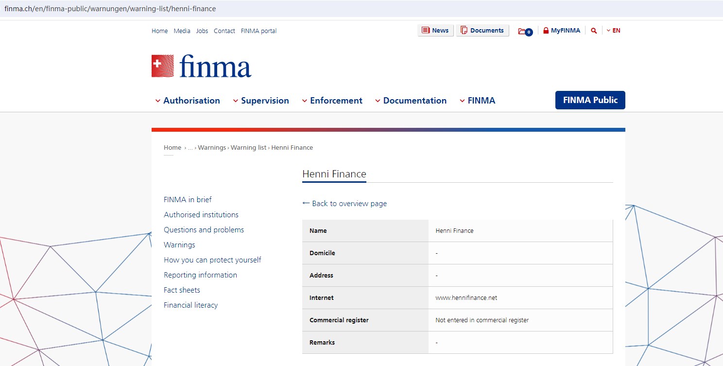 Upon investigation, we found that Henni Finance is not regulated by the FINMA.
