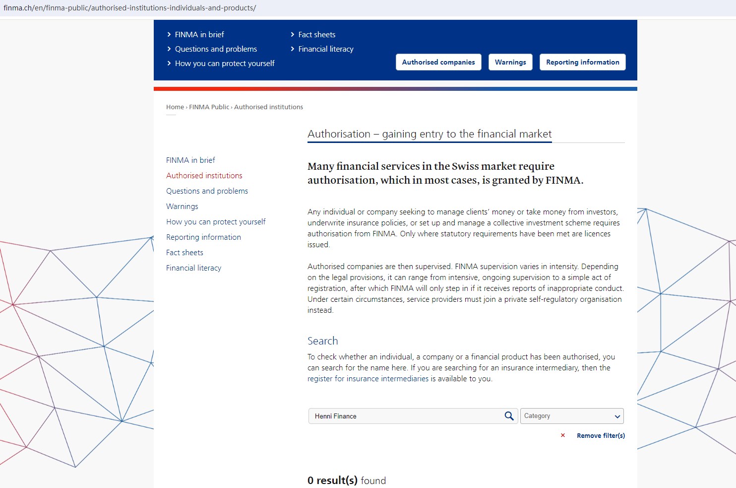 And the FINMA issued a warning against Henni Finance, stating this company might be providing financial services or products without authorization.