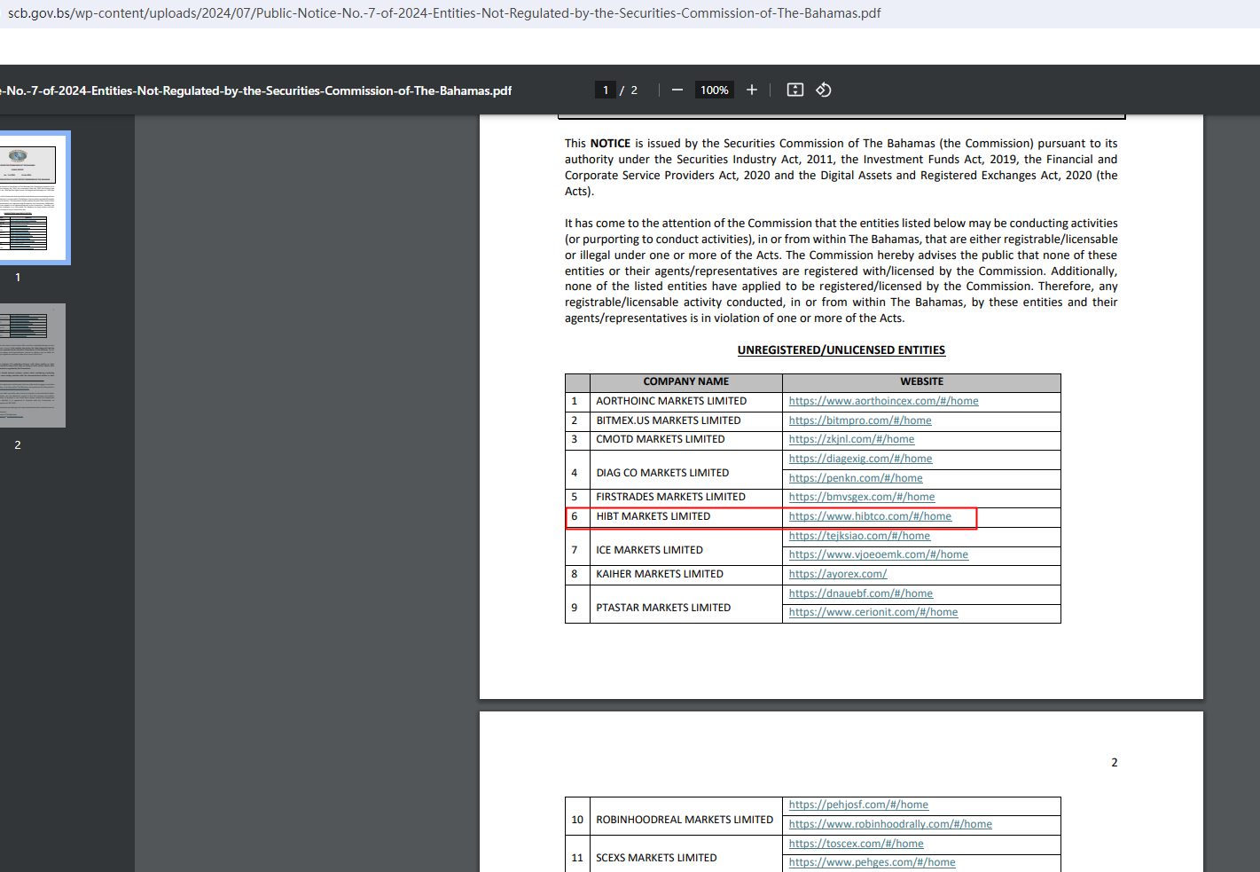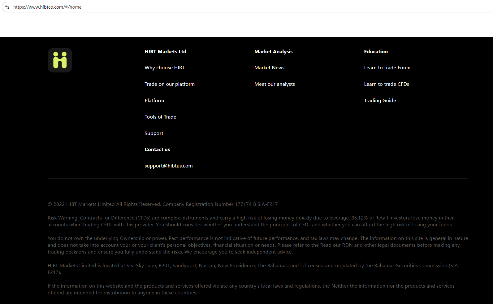 According to its website, it claims regulated by the Bahamas Securities Commission. Upon investigation, we found that the Securities Commission of The Bahamas (SCB) issued a warning against HIBT MARKETS LIMITED, which believes this company might be providing financial services or products without authorisation.