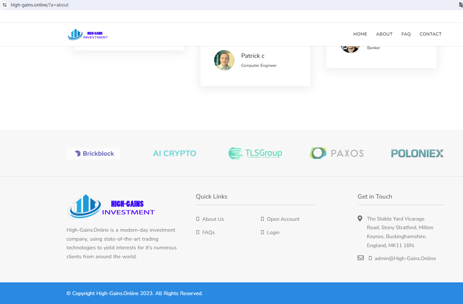 According to its website, it is located in England. Upon investigation, we found that the Financial Conduct Authority (FCA) issued a warning against HIGH GAINS INVESTMENT, believing this company might be providing financial services or products without proper authorization in the UK.