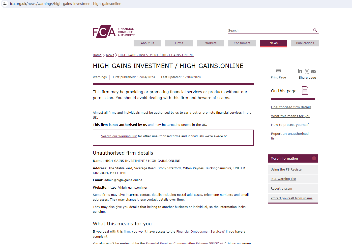 On April 17, 2024, the Financial Conduct Authority (FCA) issued a warning against HIGH GAINS INVESTMENT, believing this company might be providing financial services or products without proper authorization in the UK. https://www.fca.org.uk/news/warnings/high-gains-investment-high-gainsonline
