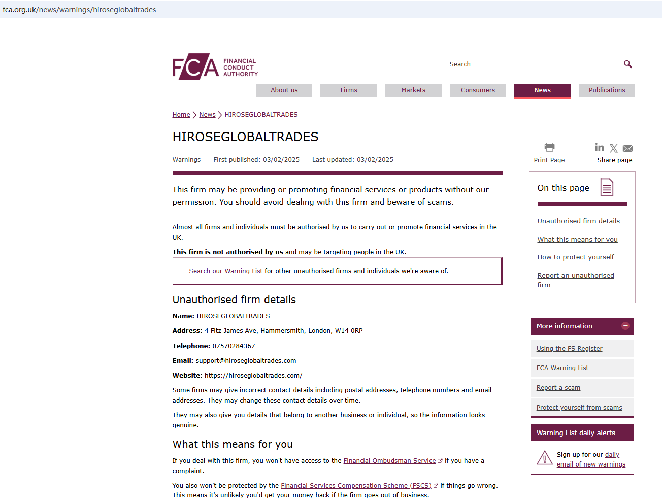 On February 3rd, 2025, the Financial Conduct Authority (FCA) issued a warning against HIROSEGLOBALTRADES, believing this company might be providing financial services or products without proper authorization in the UK. https://www.fca.org.uk/news/warnings/hiroseglobaltrades