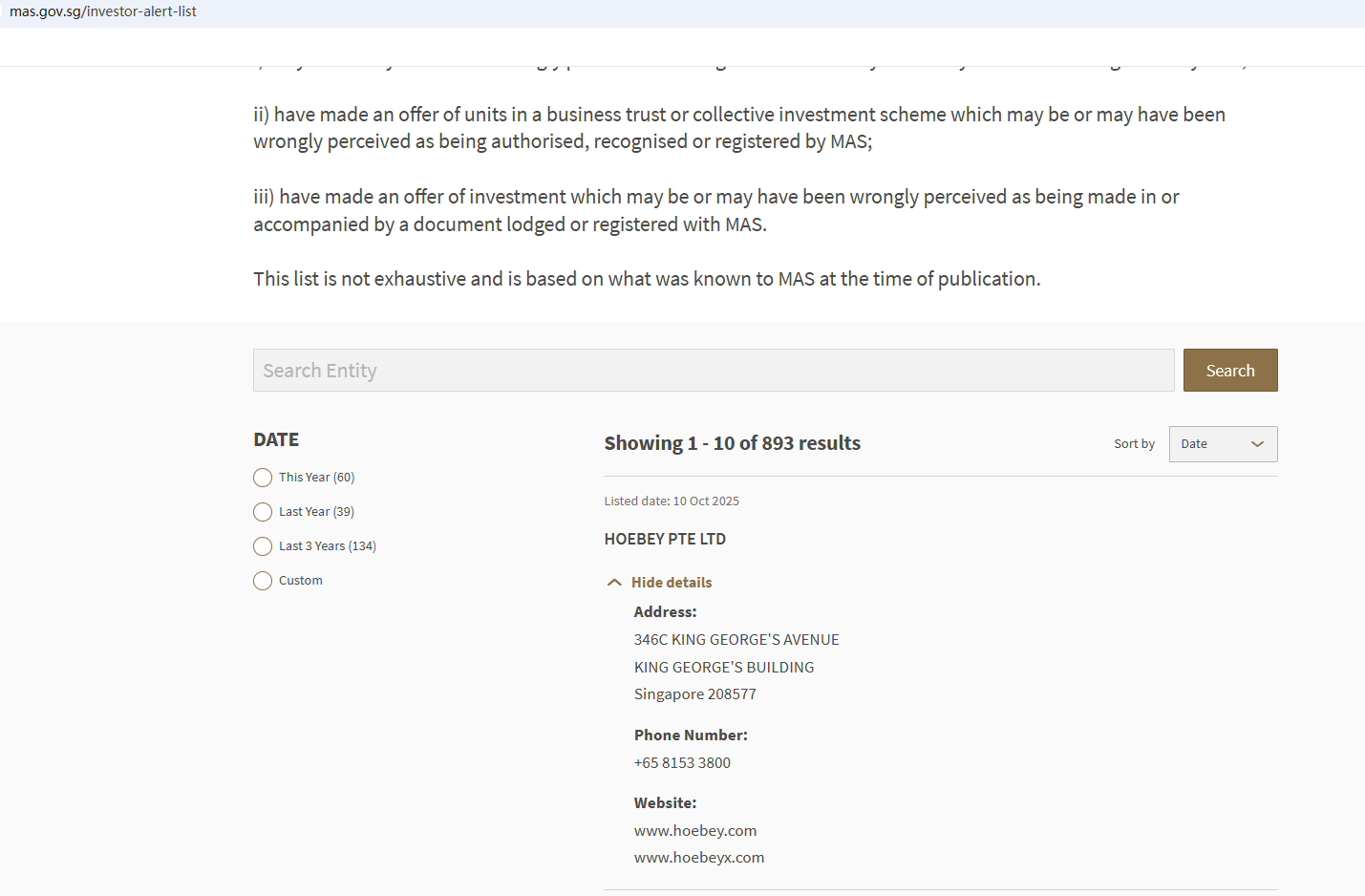 On Oct 10, 2025, the Monetary Authority of Singapore (MAS) added Hoebey to its warning list for providing investment services without being licensed. https://www.mas.gov.sg/investor-alert-list
