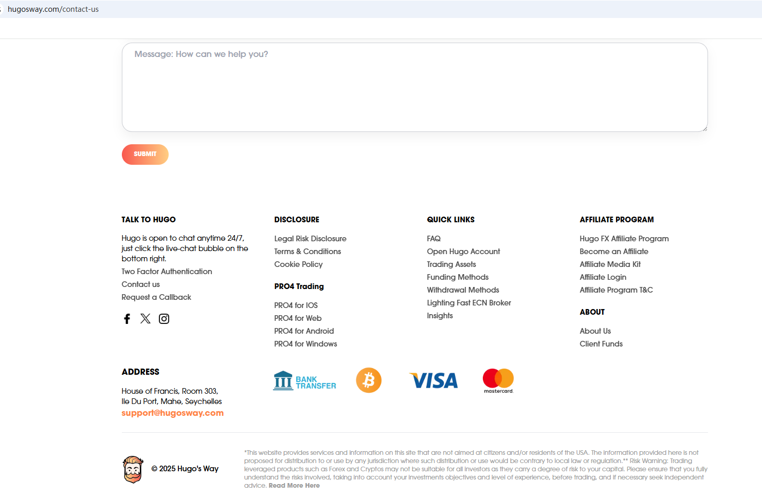 On Nov 7, 2025, the Seychelles Financial Services Authority (Seychelles FSA) issued a warning against Hugo's Way for the lack of the required authorization. https://fsaseychelles.sc/media-corner/regulatory-updates/warning-unauthorised-activity-under-the-virtual-asset-service-providers-act-2024-and-securities-act-2007-as-amended