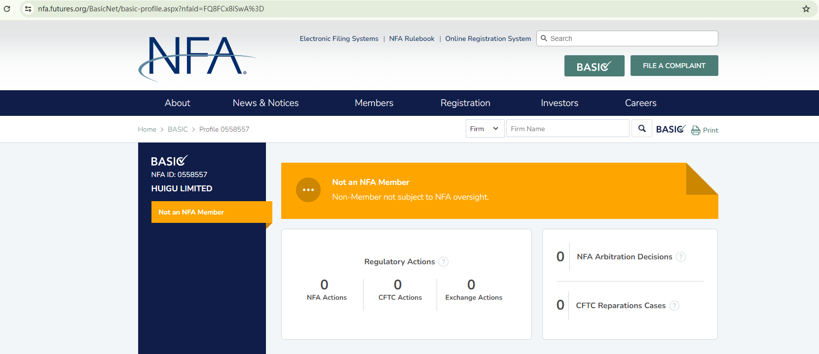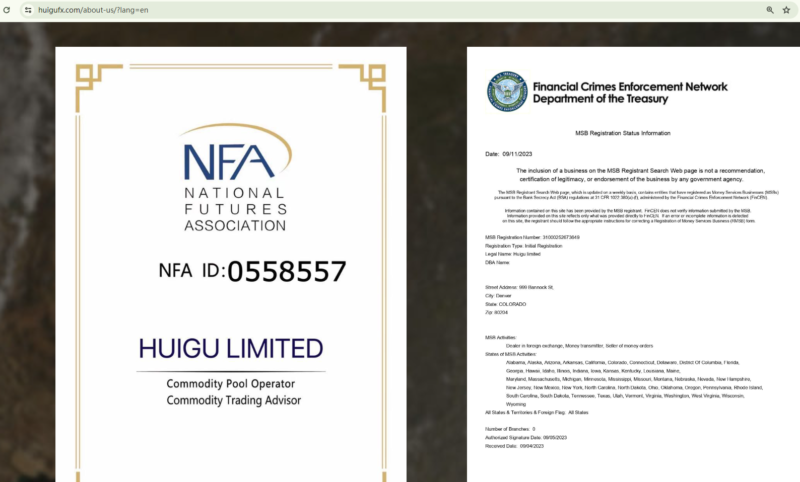 Huigu Limited purports to be a forex broker, allegedly holding ID 0558557 issued by the National Futures Association (NFA), and the MSB registration with the Financial Crimes Enforcement Network (FinCEN).