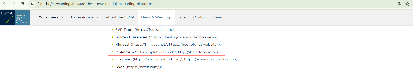 On March 14, 2024, the Belgian Financial Services and Markets Authority (FSMA) added IB Platform to its warning list as a fraudulent trading platform. https://www.fsma.be/en/warnings/baware-these-new-fraudulent-trading-platforms
