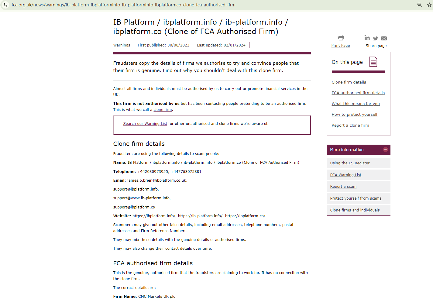 On 30 August 2023, the United Kingdom Financial Conduct Authority (UK FCA) issued a warning that IB Platform was providing financial services or products in the UK without authorisation. You may visit: https://www.fca.org.uk/news/warnings/ib-platform-ibplatforminfo-clone-fca-authorised-firm