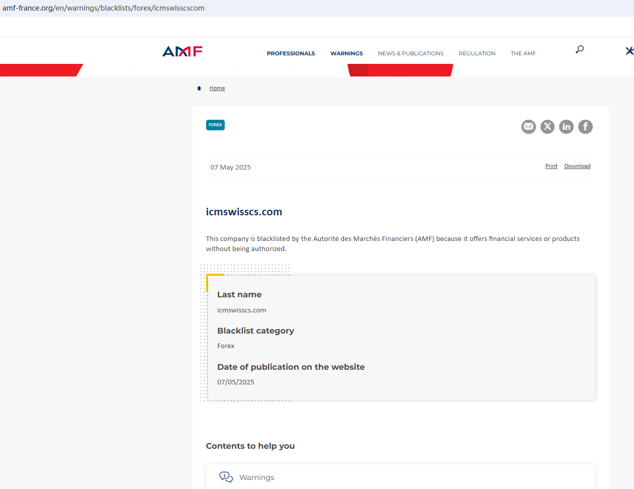 On May 7, 2025, the Financial Authority (Autorité des Marchés Financiers, AMF) added ICMswissCS to warning list for it being an unauthorized company engaging in forex activities. https://www.amf-france.org/en/warnings/blacklists/forex/icmswisscscom