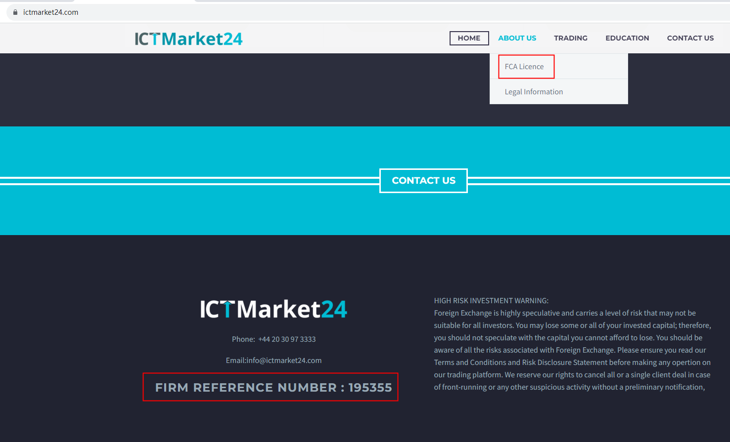 ICT Market 24 claims to be regulated by Financial Conduct Authority (FCA), reference number: 195355. We searched the FCA for this number but discovered that it is linked to another company, IG Markets Limited, whose website is http://www.ig.com/, which has nothing to do with ICT Market 24. It is a red flag.