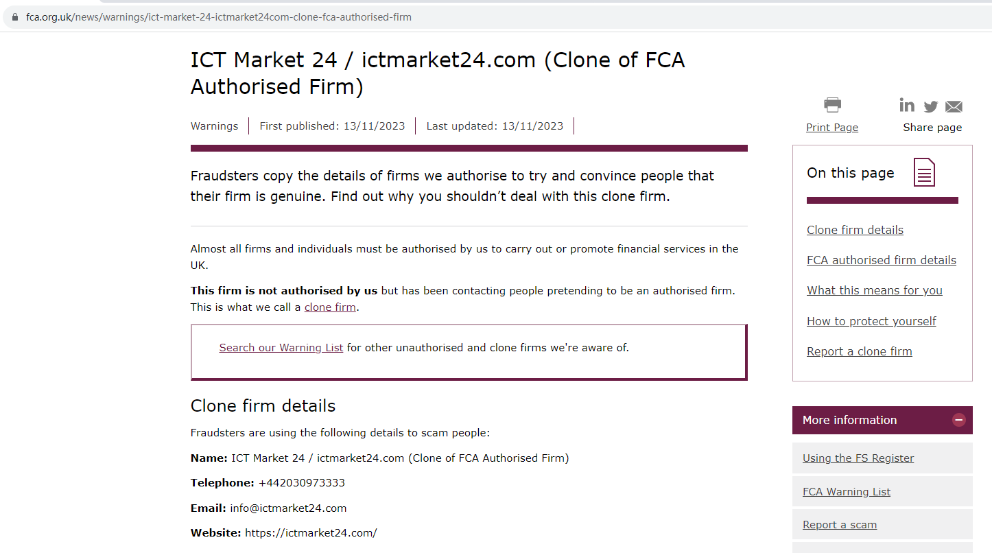 On 13 November 2023, the United Kingdom Financial Conduct Authority (UK FCA) issued a warning that ICT Market 24 was a clone of FCA Authorised firm, IG Markets Limited. You may visit: https://www.fca.org.uk/news/warnings/ict-market-24-ictmarket24com-clone-fca-authorised-firm