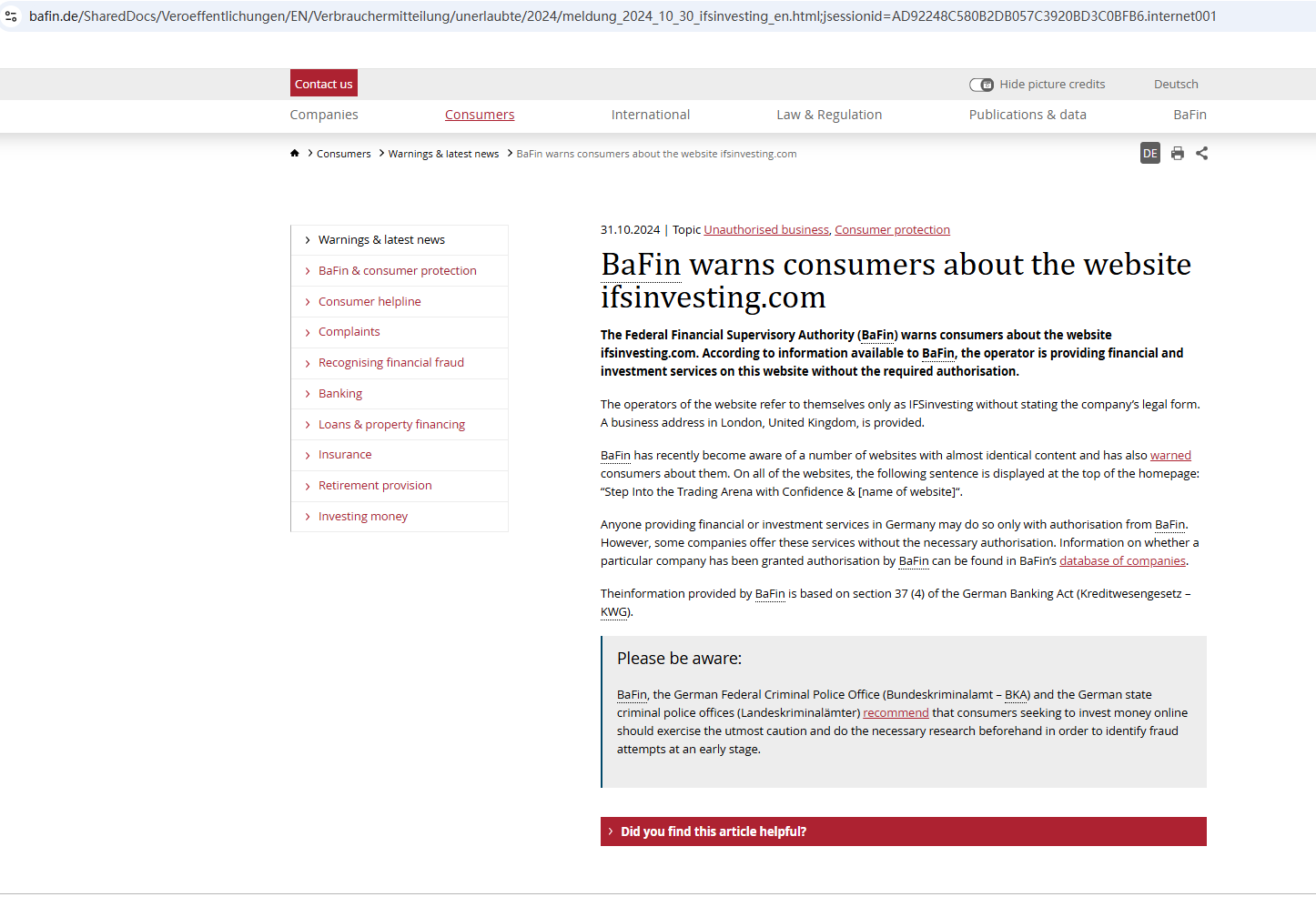 On October 31, 2024, the Federal Financial Supervisory Authority (BaFin) warned consumers about the services offered by the company IFSinvesting (ifsinvesting.com), which is offering financial and investment services without the required authorization. https://www.bafin.de/SharedDocs/Veroeffentlichungen/EN/Verbrauchermitteilung/unerlaubte/2024/meldung_2024_10_30_ifsinvesting_en.html;jsessionid=AD92248C580B2DB057C3920BD3C0BFB6.internet001